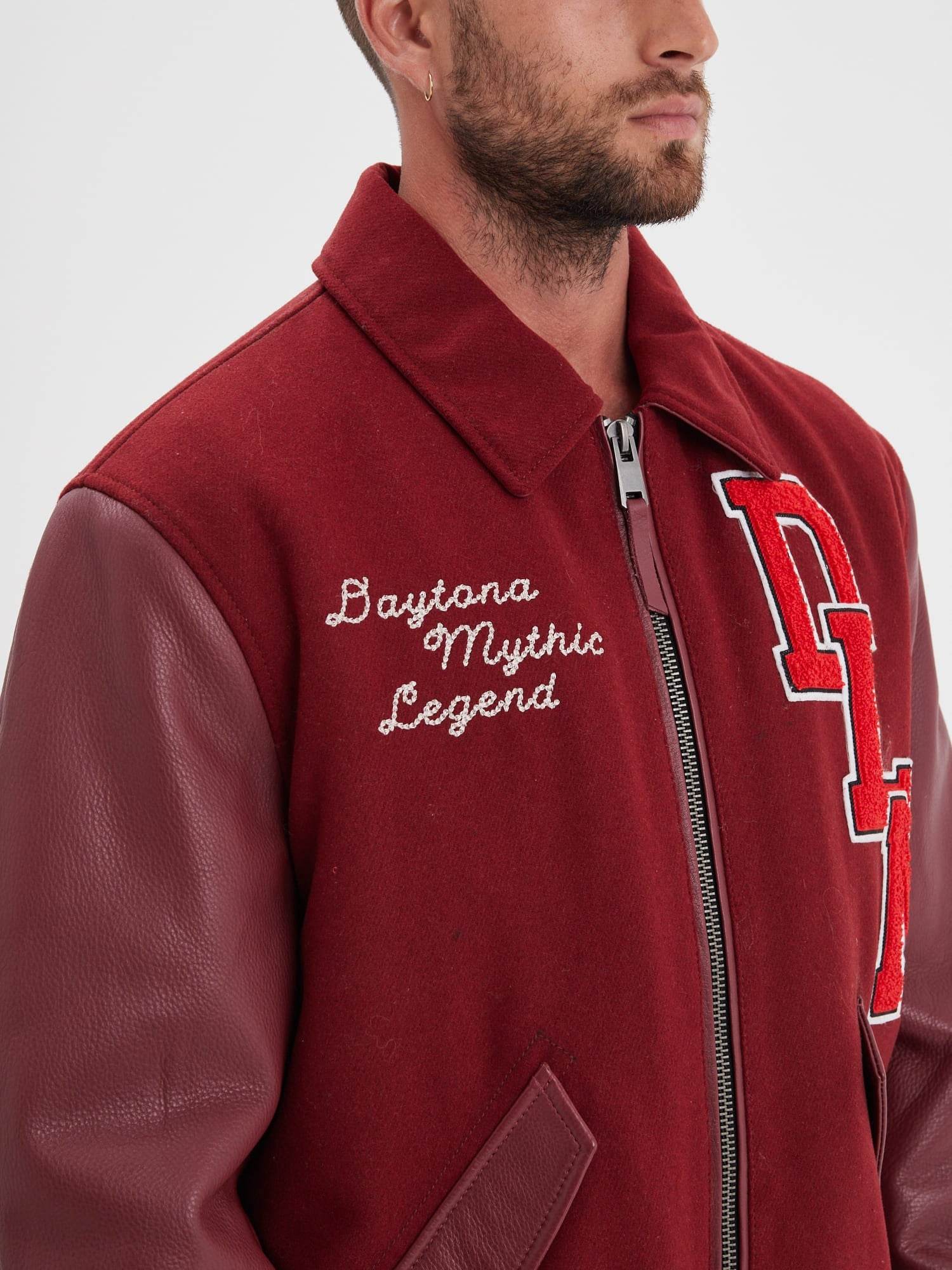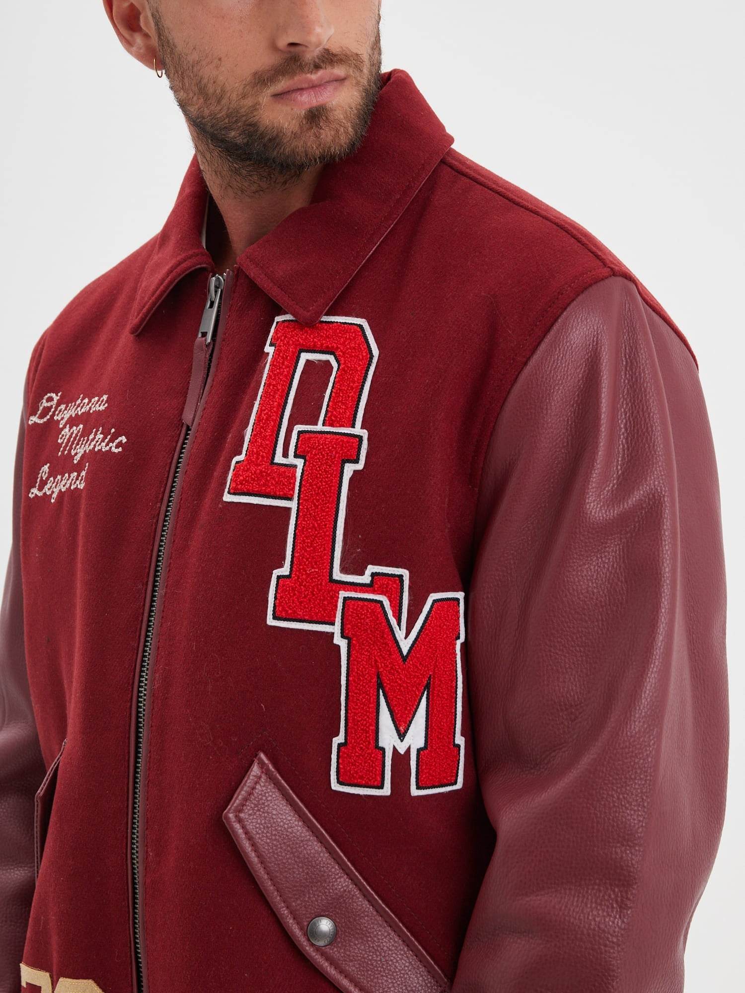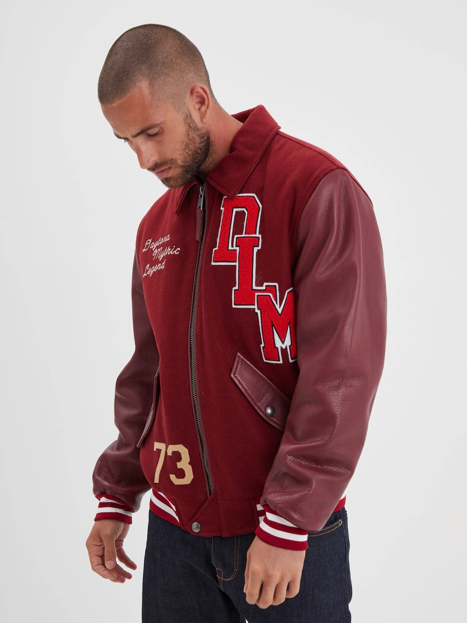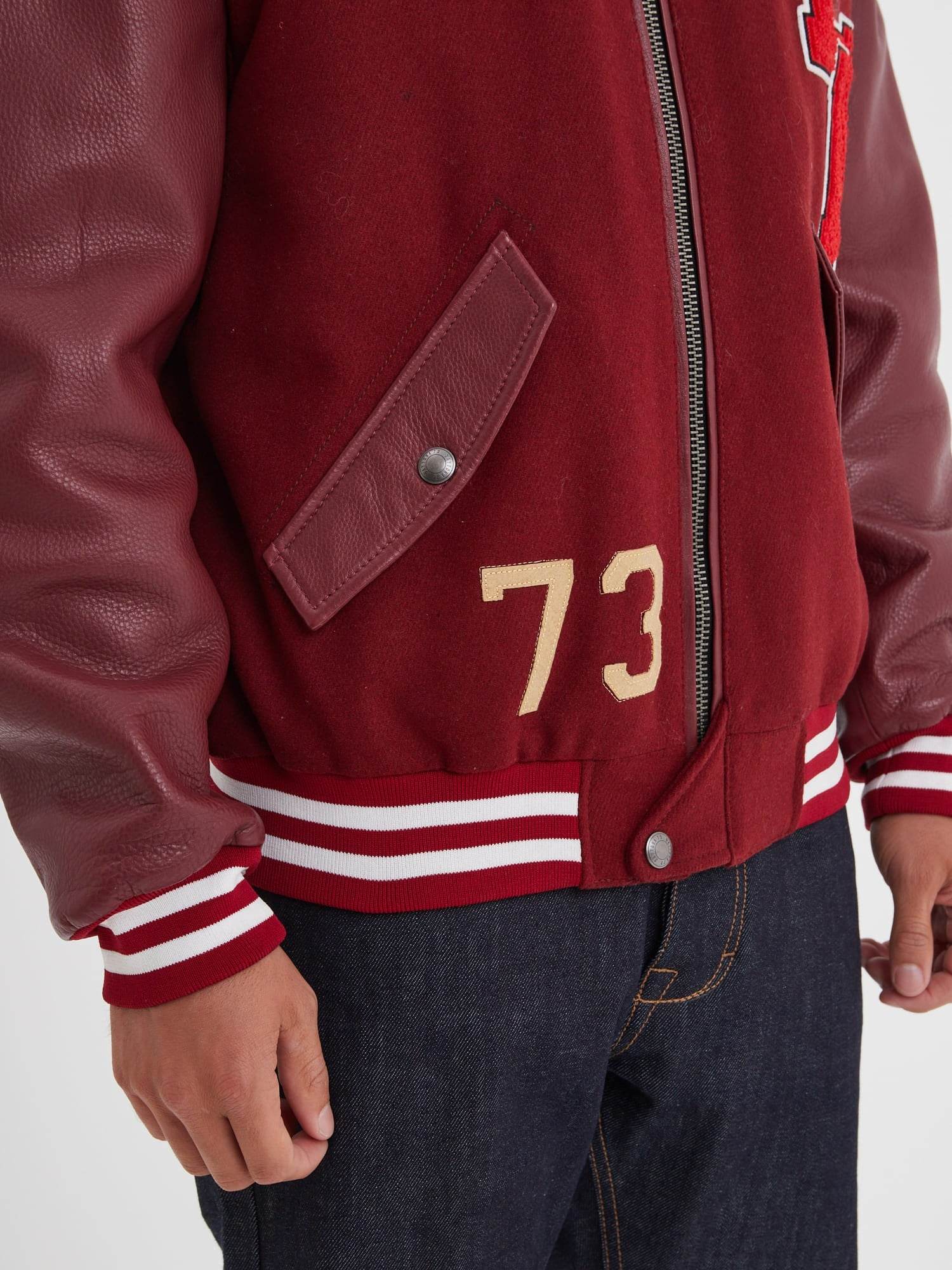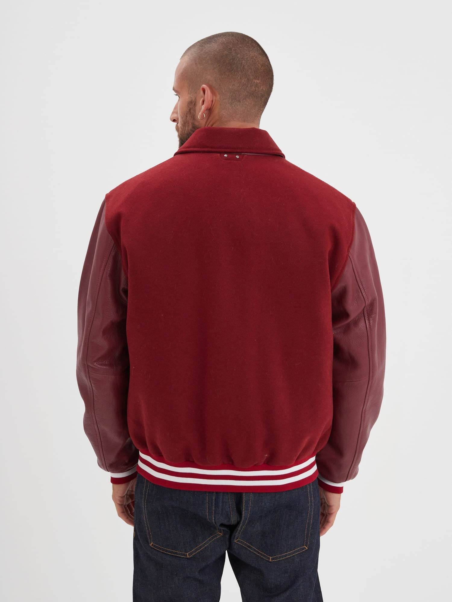The teddy jacket is distinguished by a distinctive design: a thick wool body, often in bright colors, paired with contrasting leather sleeves. The collar, cuffs, and waistband are often striped knit, adding a sporty touch to the ensemble. Teddy jackets also feature embroidered letters or patches, usually representing the initial of the athlete's university or high school, as well as their athletic accomplishments.