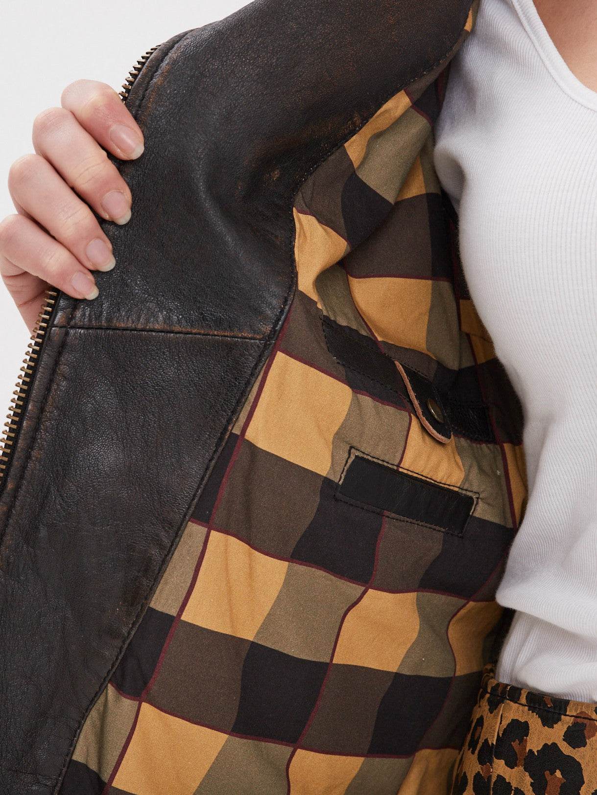 Ce blouson biker en cuir d'agneau vieilli au tannage végétal allie l'authenticité du cuir au respect de l'environnement. Sa coupe ajustée et ses finitions soignées offrent un look moderne et rebelle. Le cuir, au fini patiné, se bonifie avec le temps, rendant chaque pièce unique.
