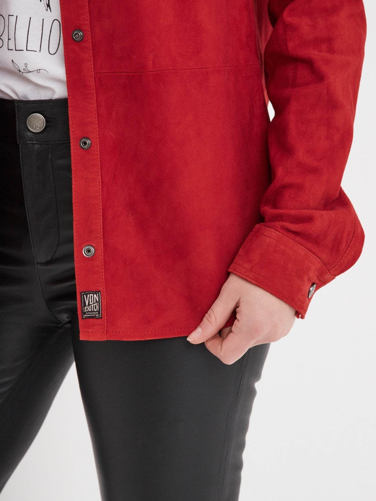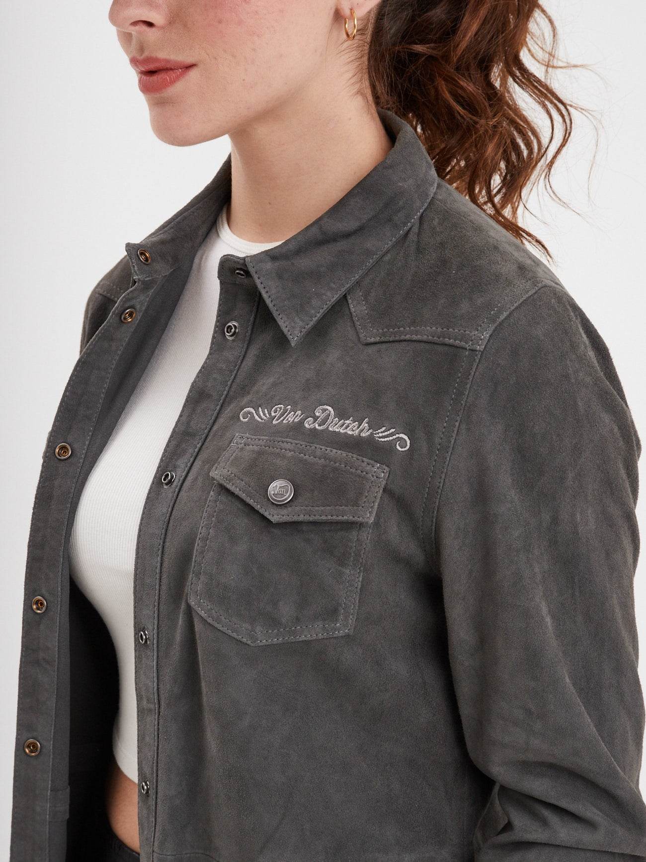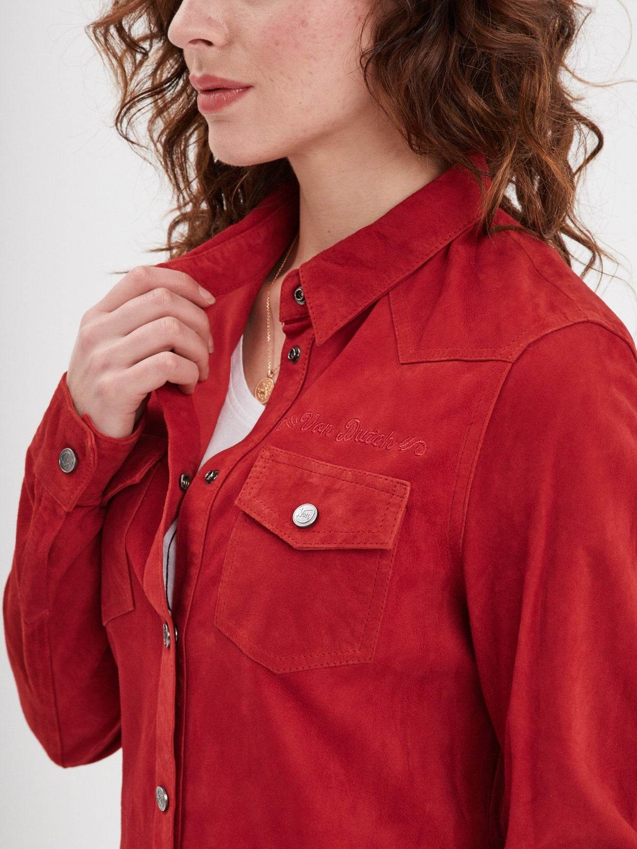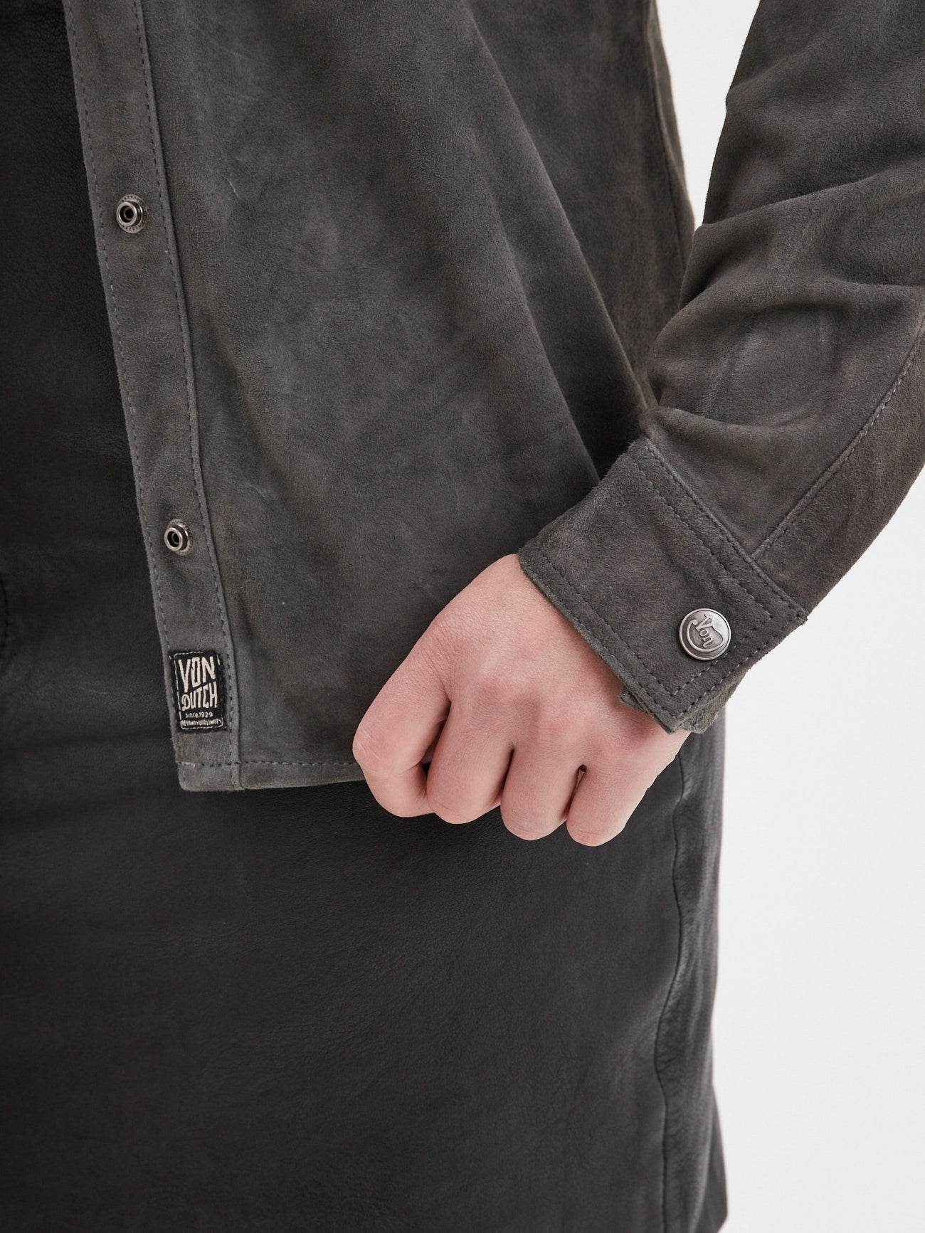 Cette chemises à boutonnière personnalisée est fabriquée dans un cuir de chèvre velours. Ce modèle à la coupe ajustée dispose d'une broderie à la poitrine reprenant le logo "Von Dutch".