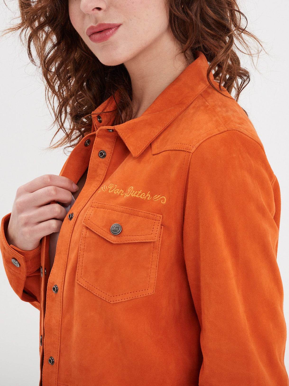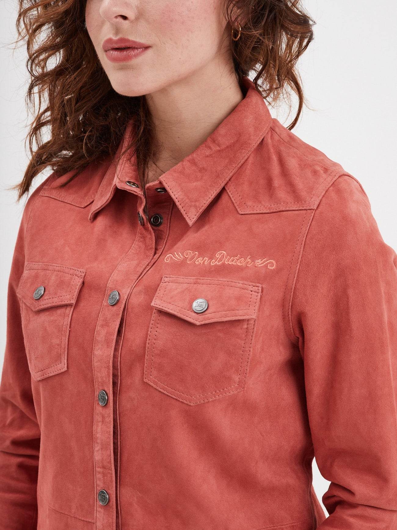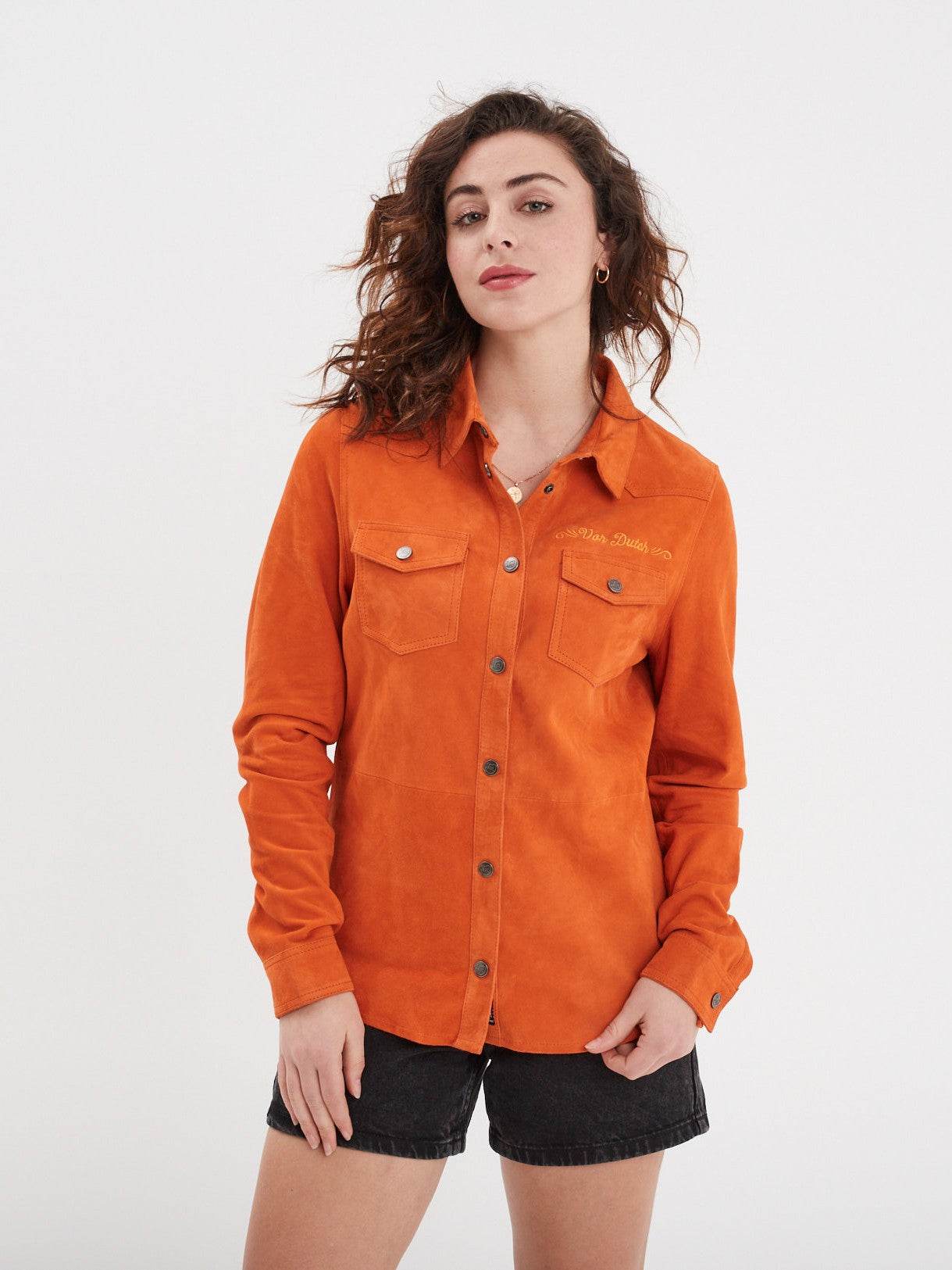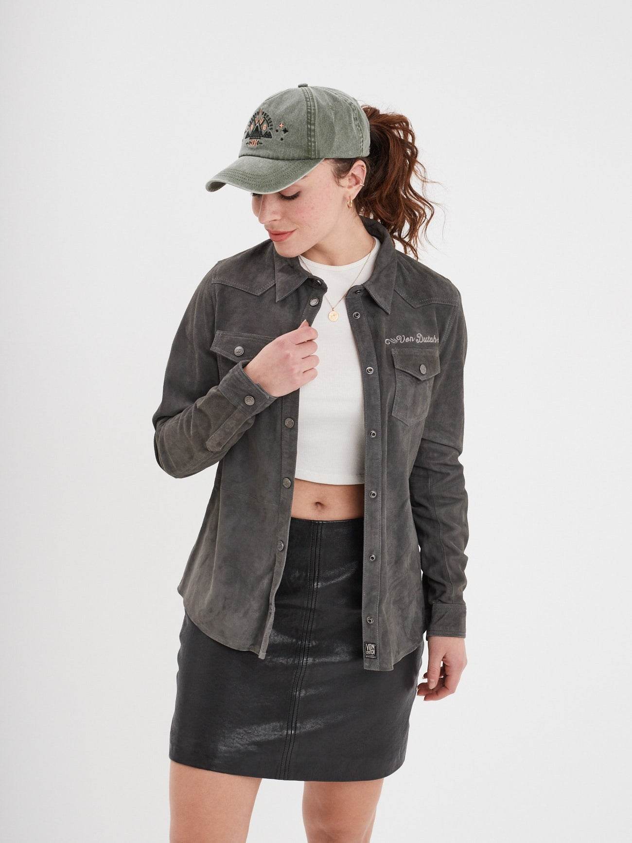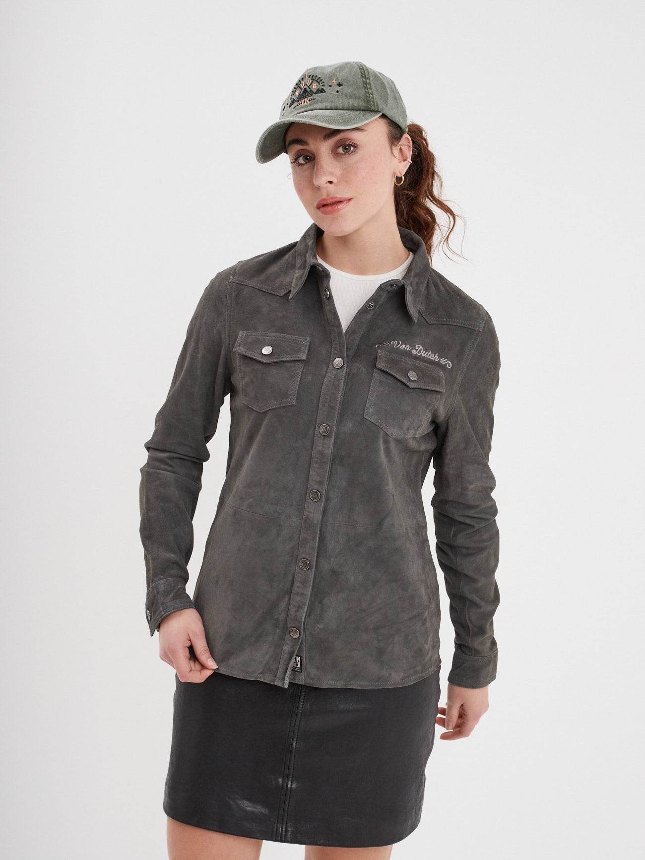 Cette chemises à boutonnière personnalisée est fabriquée dans un cuir de chèvre velours. Ce modèle à la coupe ajustée dispose d'une broderie à la poitrine reprenant le logo "Von Dutch".