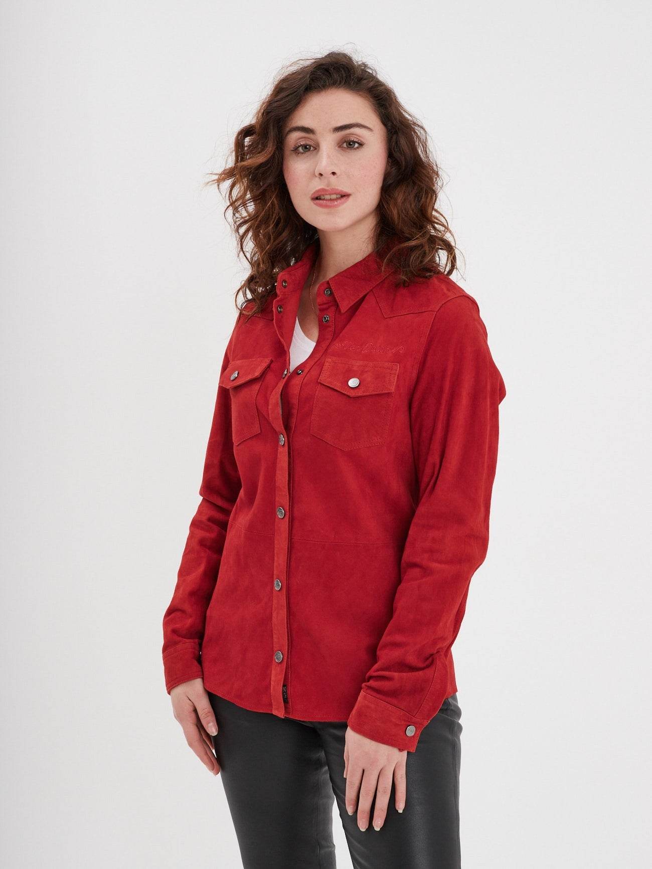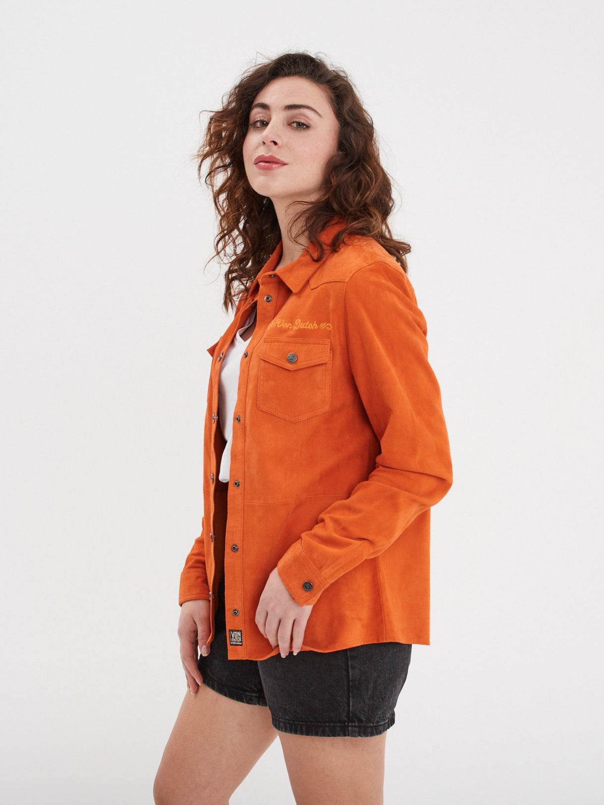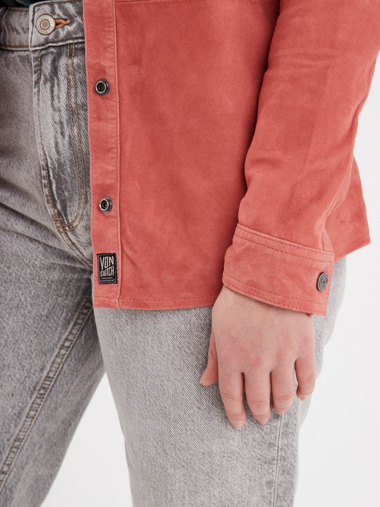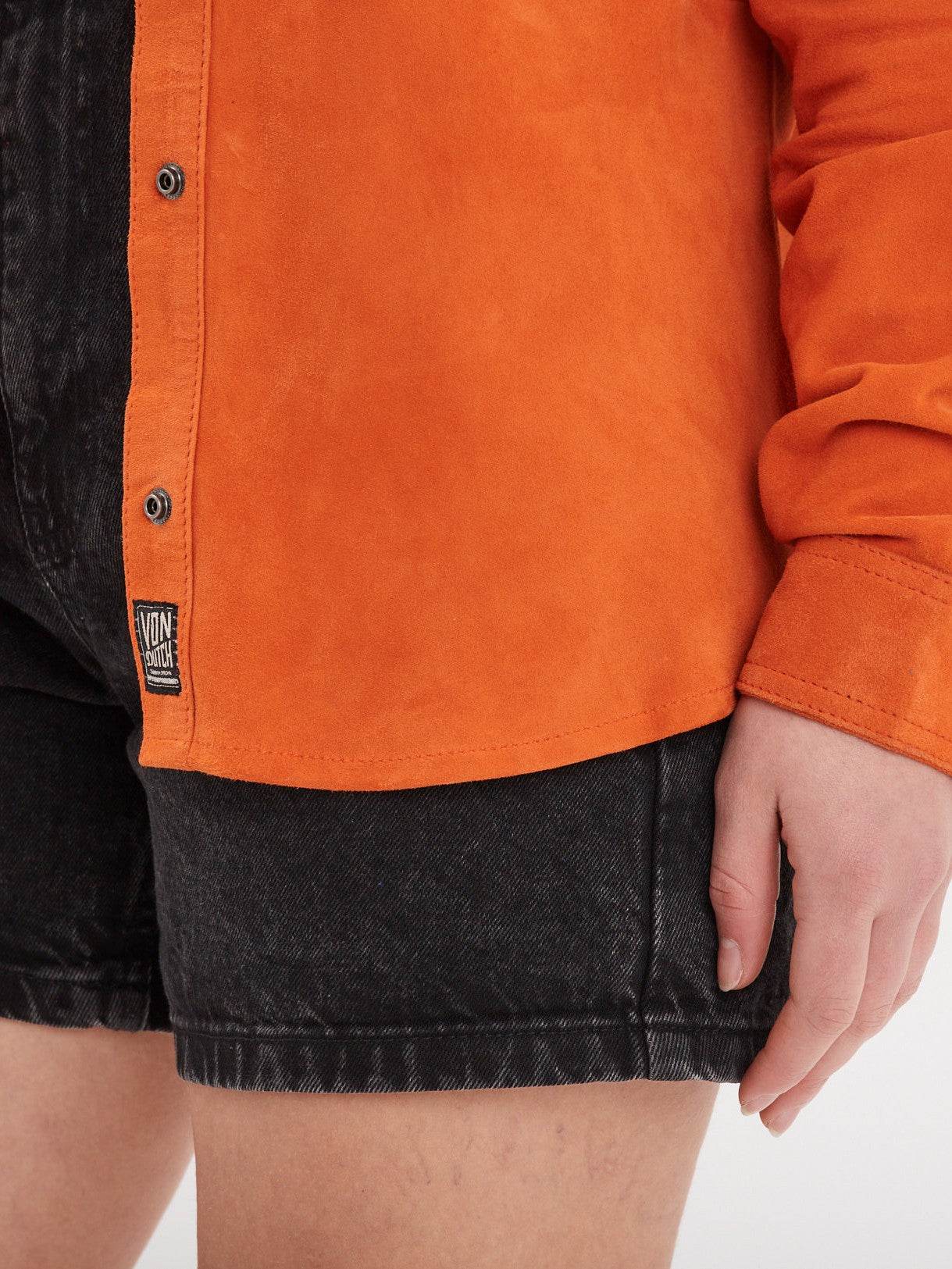 Cette chemises à boutonnière personnalisée est fabriquée dans un cuir de chèvre velours. Ce modèle à la coupe ajustée dispose d'une broderie à la poitrine reprenant le logo "Von Dutch".