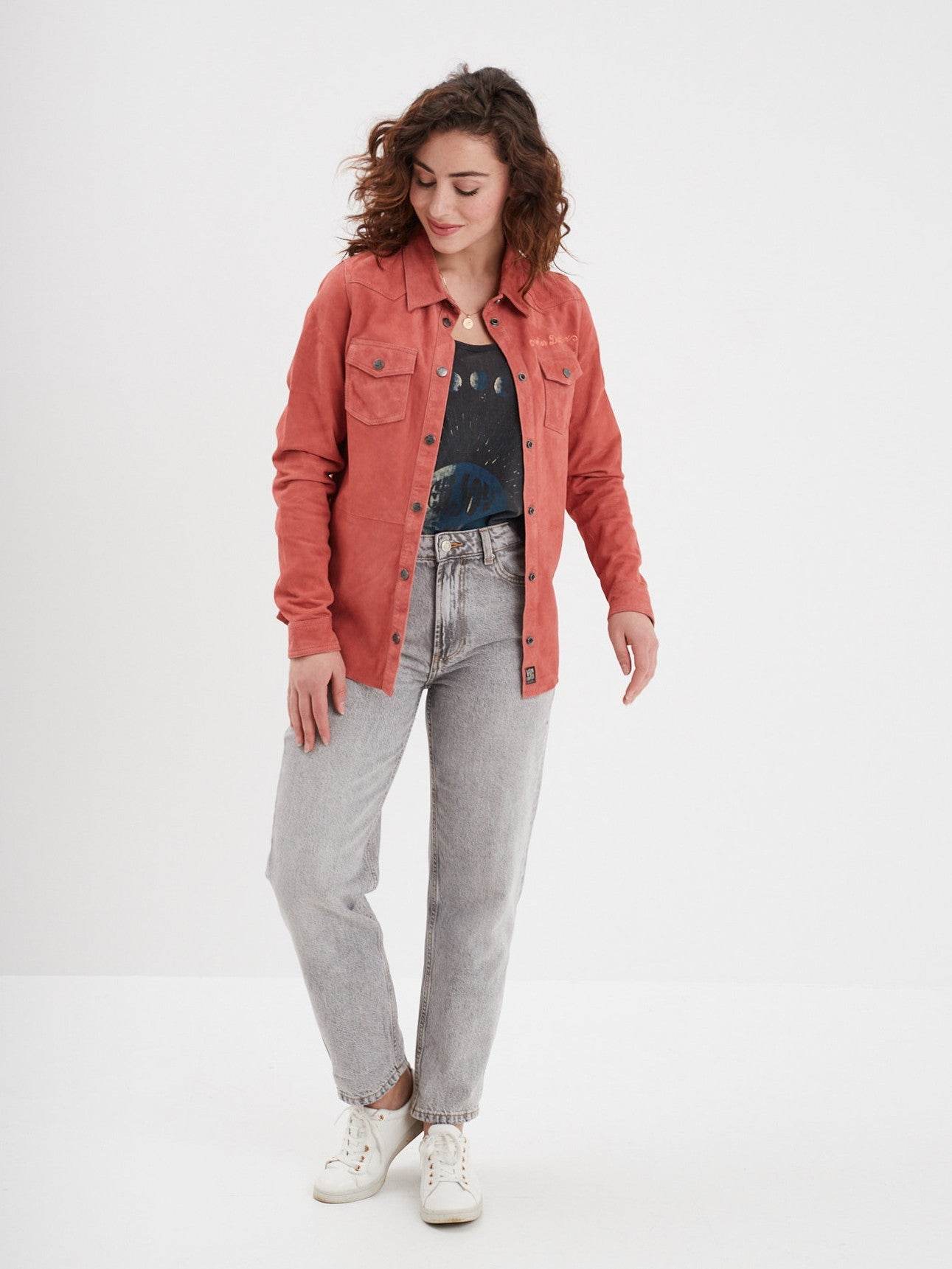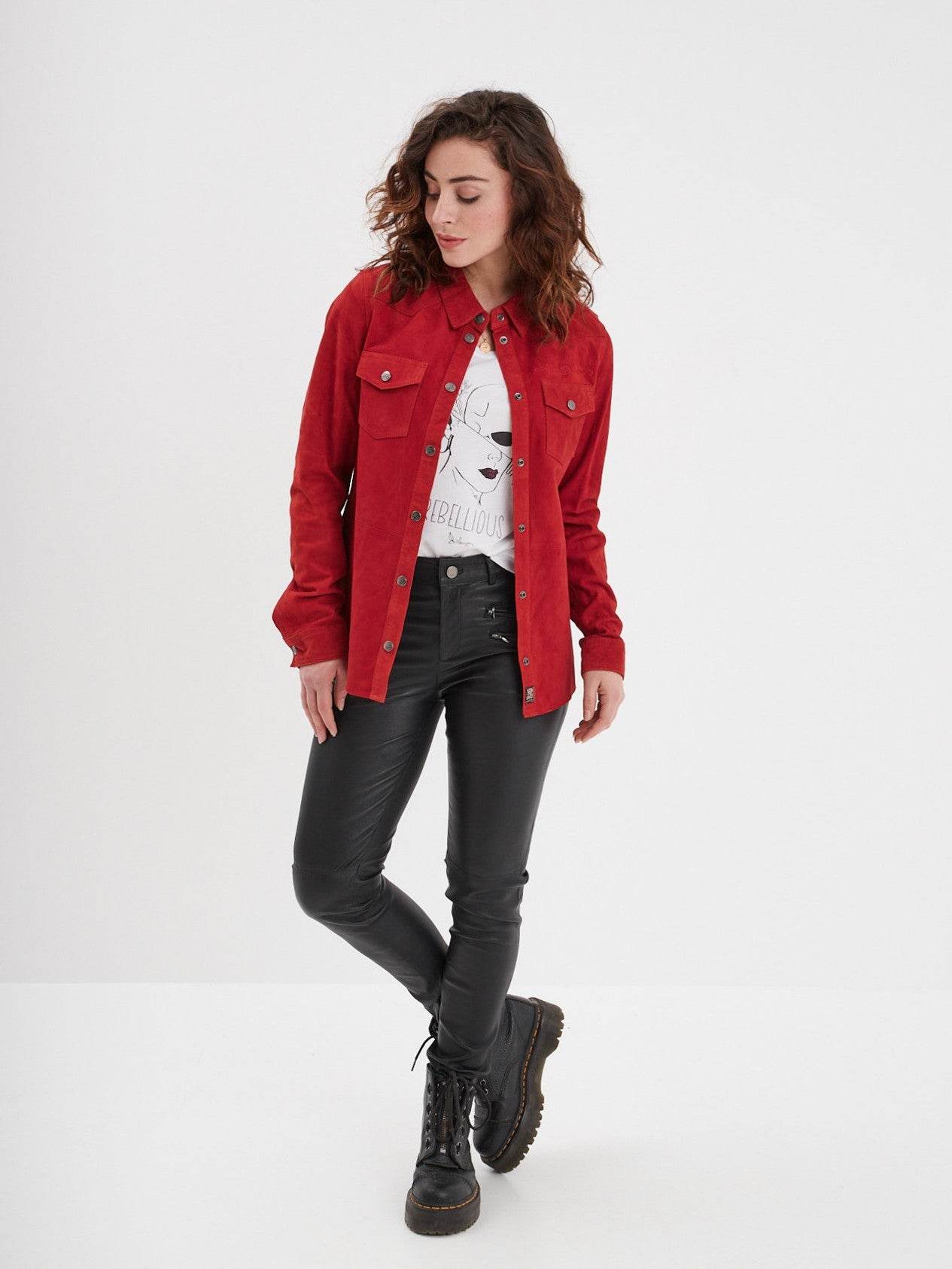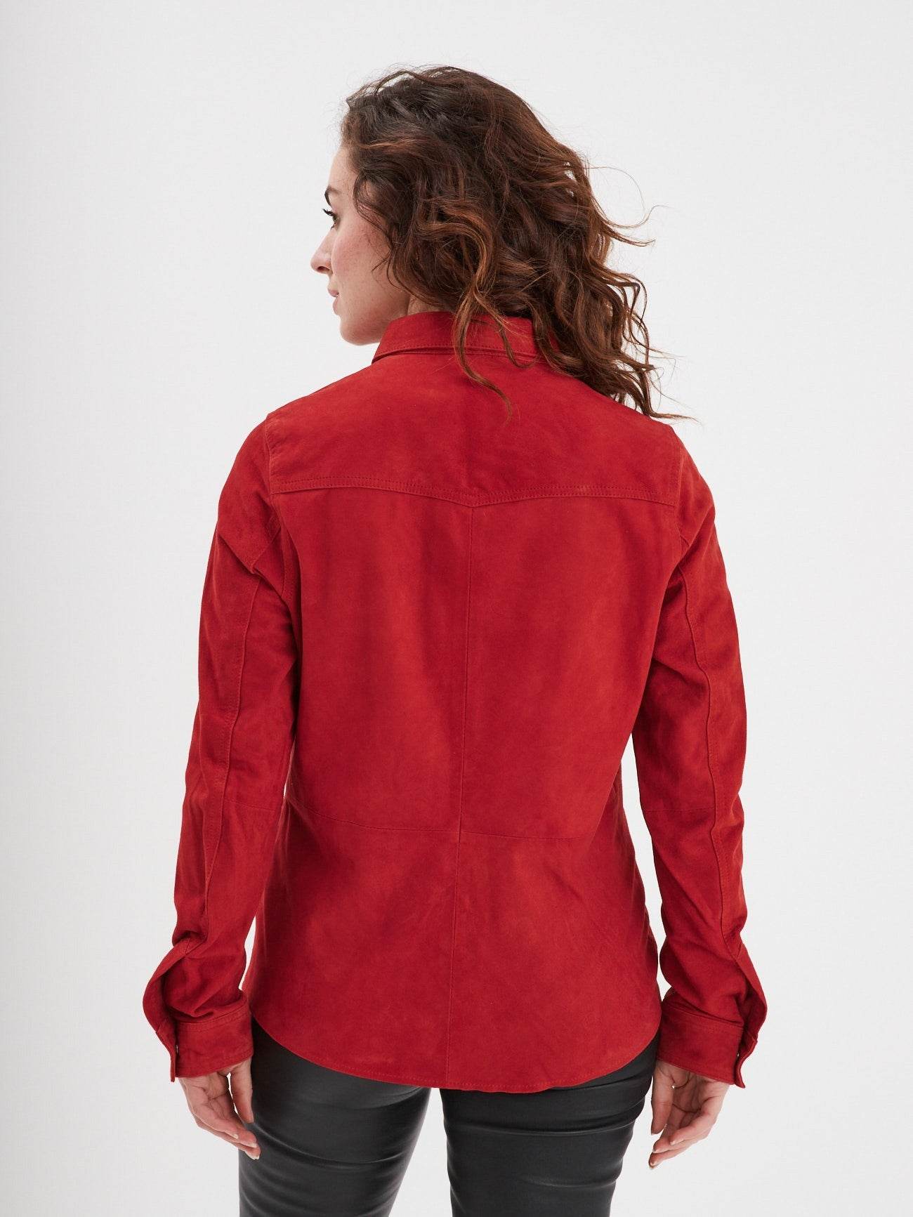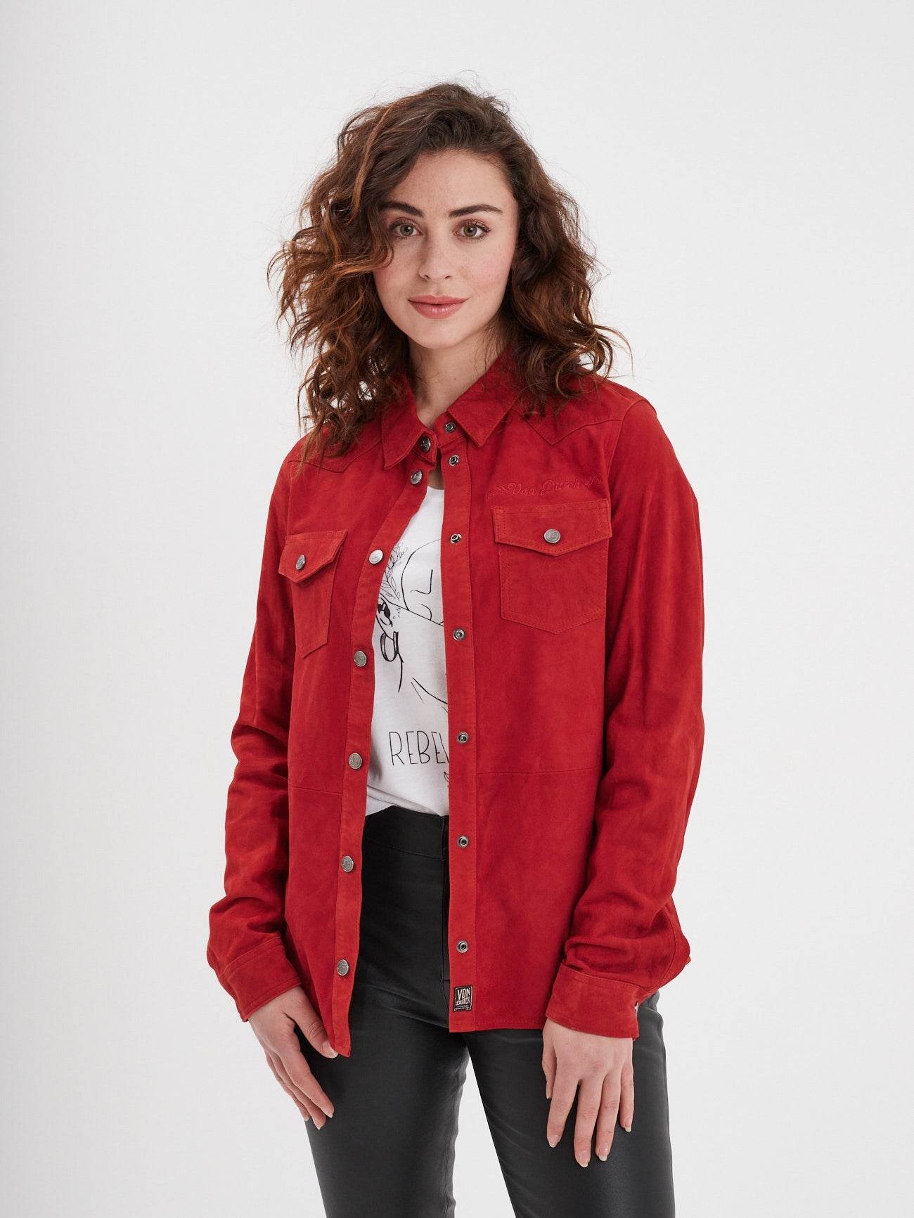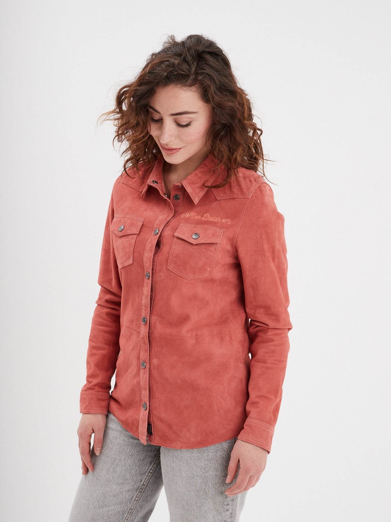 Cette chemises à boutonnière personnalisée est fabriquée dans un cuir de chèvre velours. Ce modèle à la coupe ajustée dispose d'une broderie à la poitrine reprenant le logo "Von Dutch".