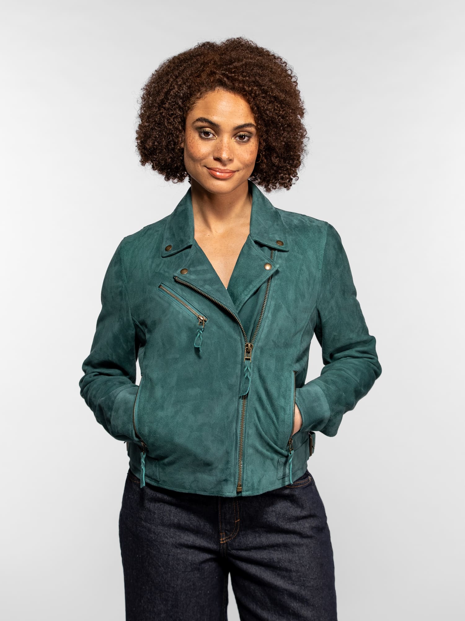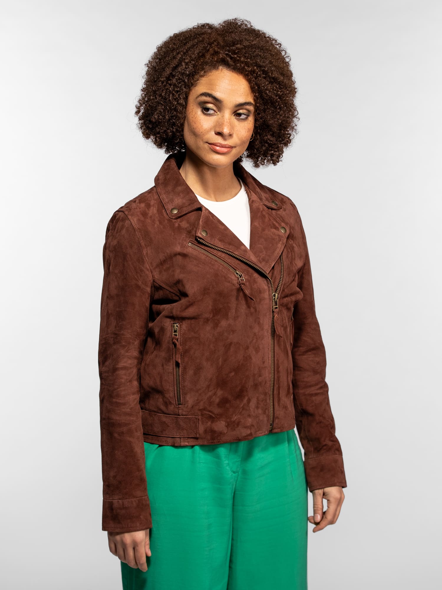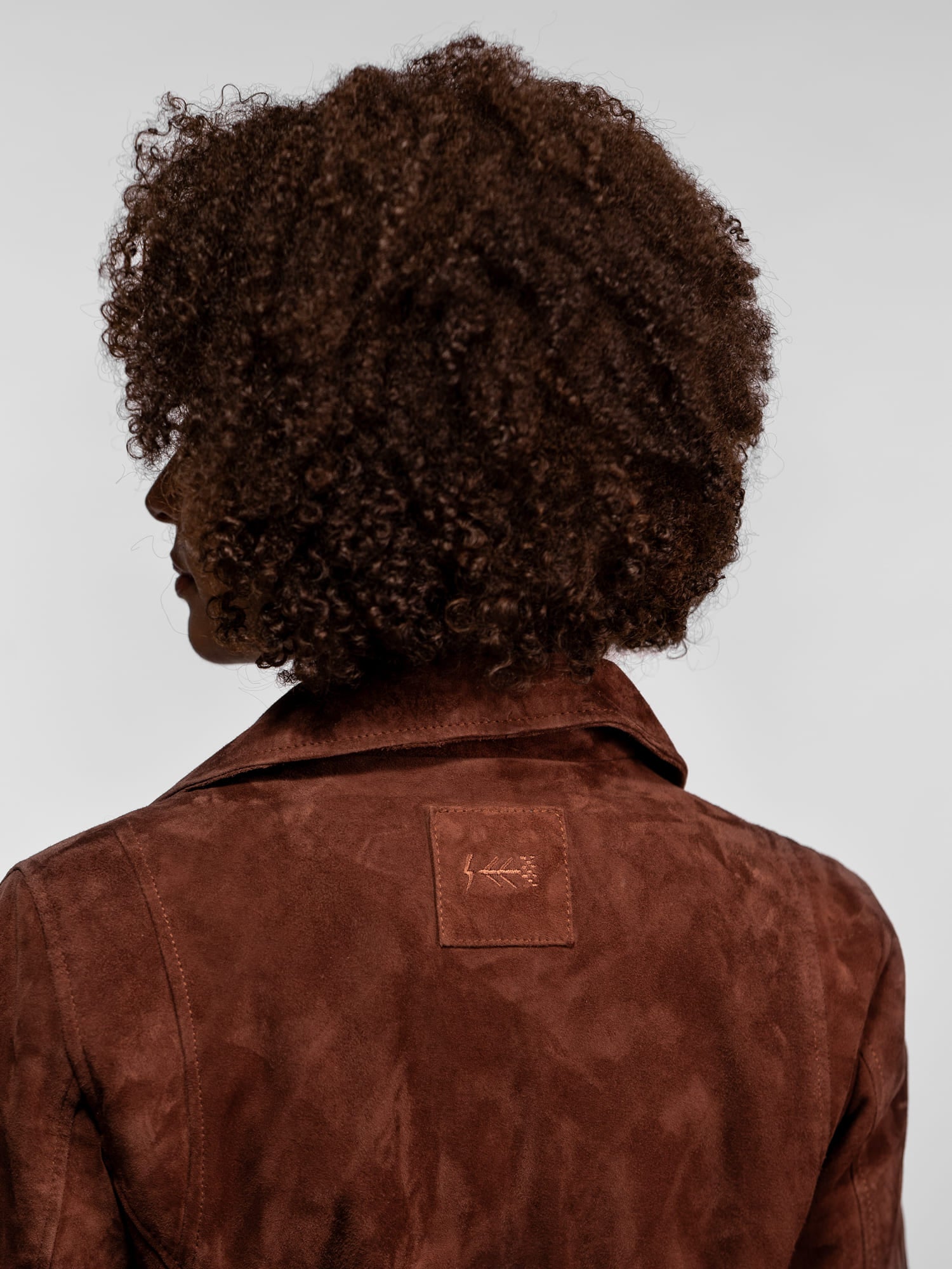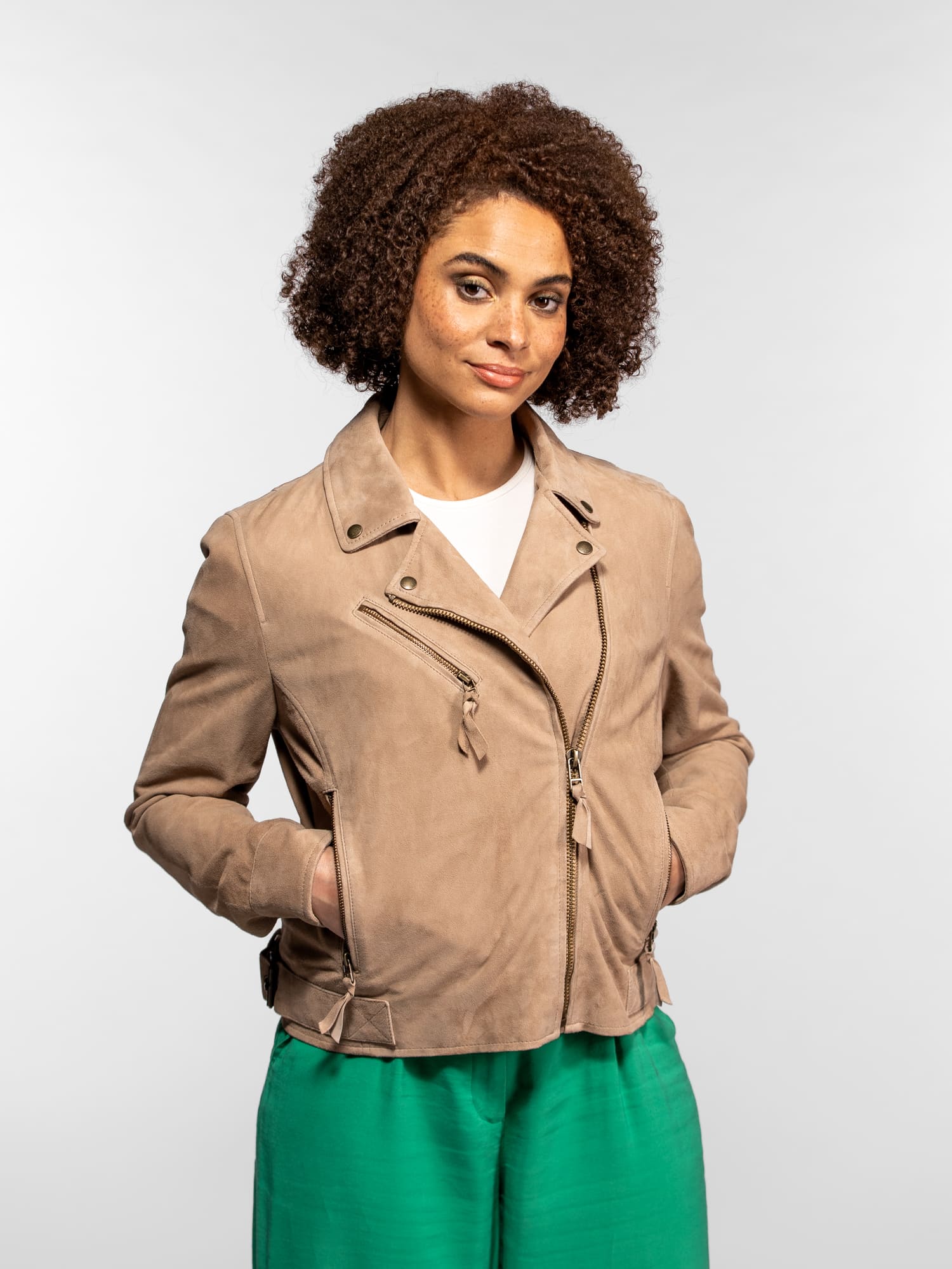 Le blouson femme Fern suede séduit par son toucher velouté et sa coupe ajustée qui met en valeur la silhouette. Il se distingue par ses zips apparents, ses finitions soignées et sa doublure léopard qui apporte une touche audacieuse. Une pièce de caractère, facile à porter au quotidien.