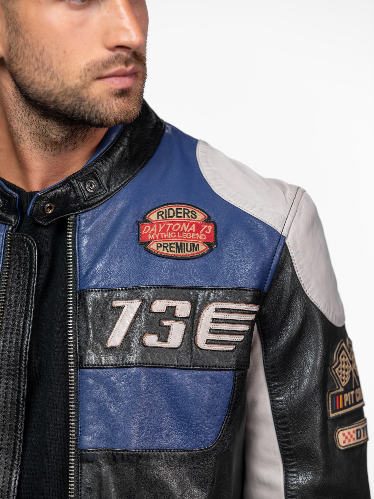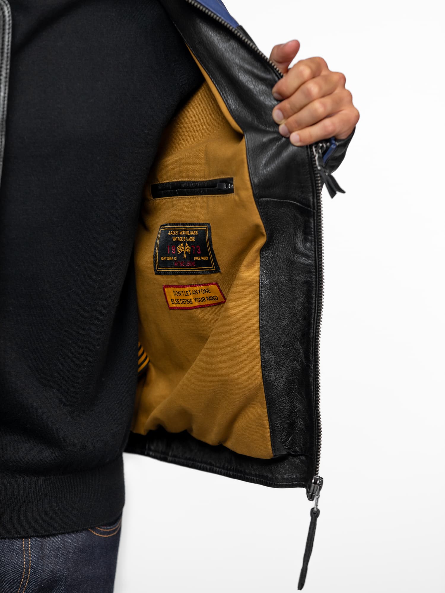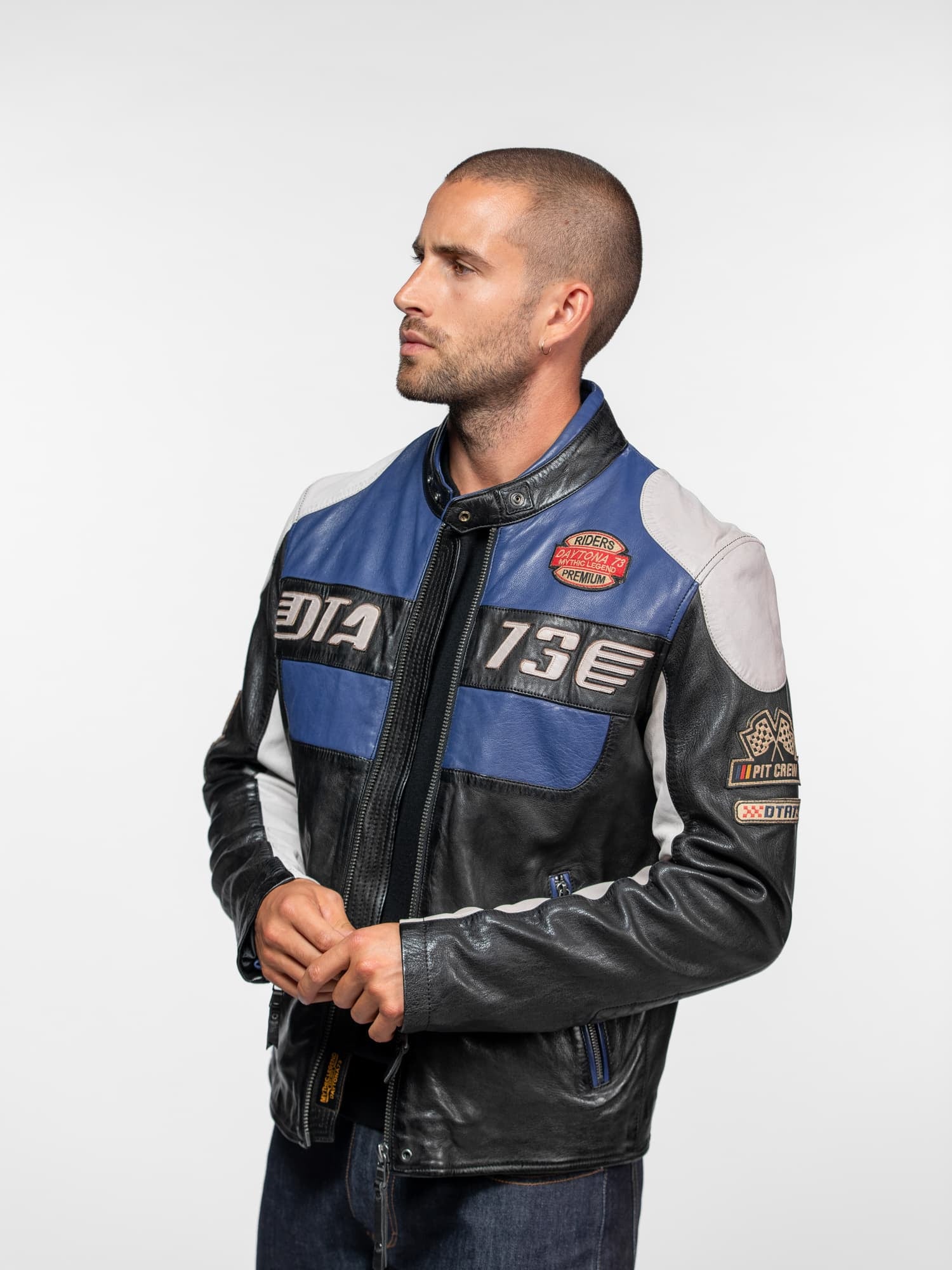 Surfez sur la tendance racing avec ce blouson en cuir d'agneau souple et léger, tanné de manière écologique. Conçu pour les passionnés de moto, il possède une coupe ajustée pour sublimer votre silhouette.