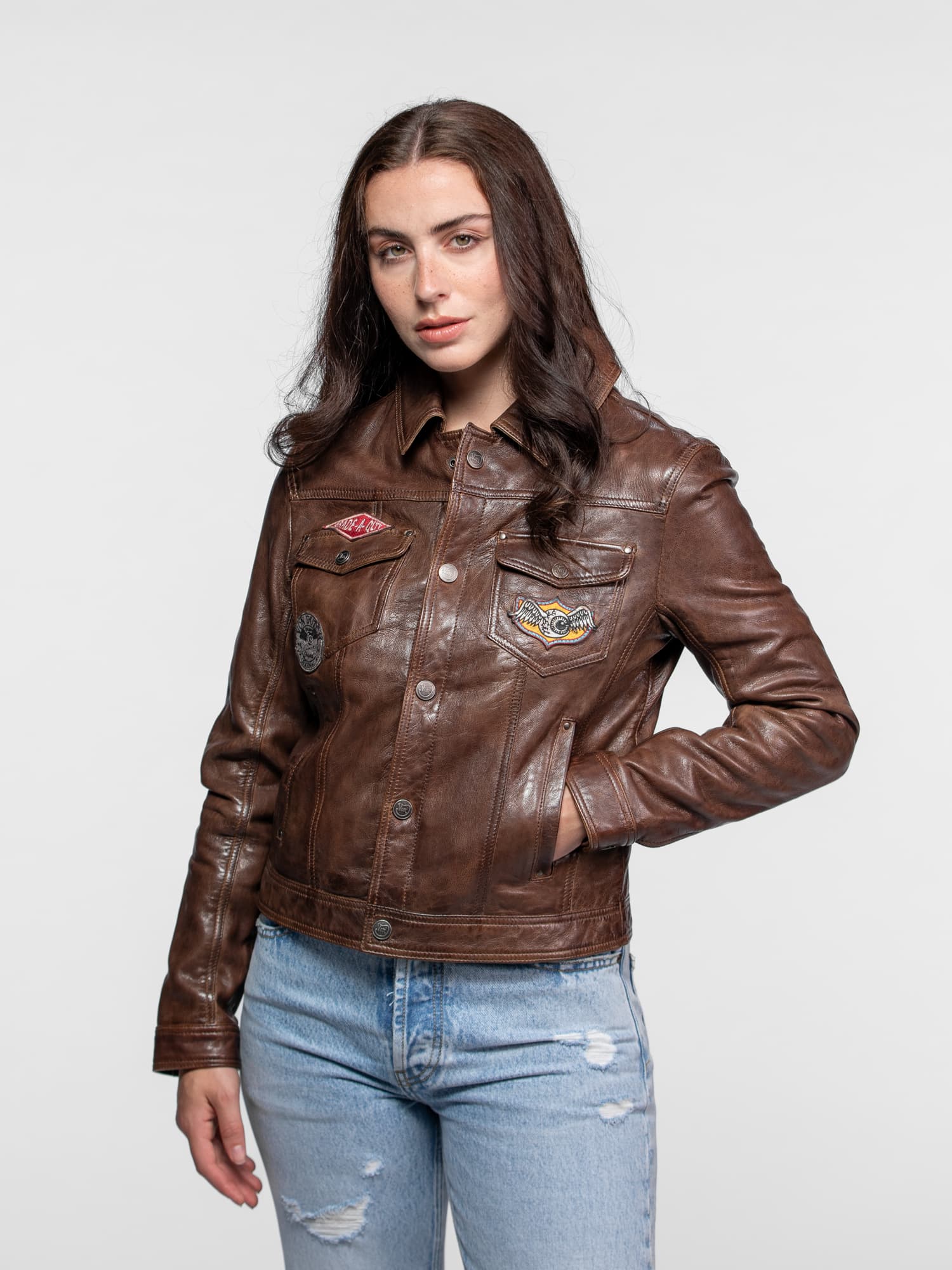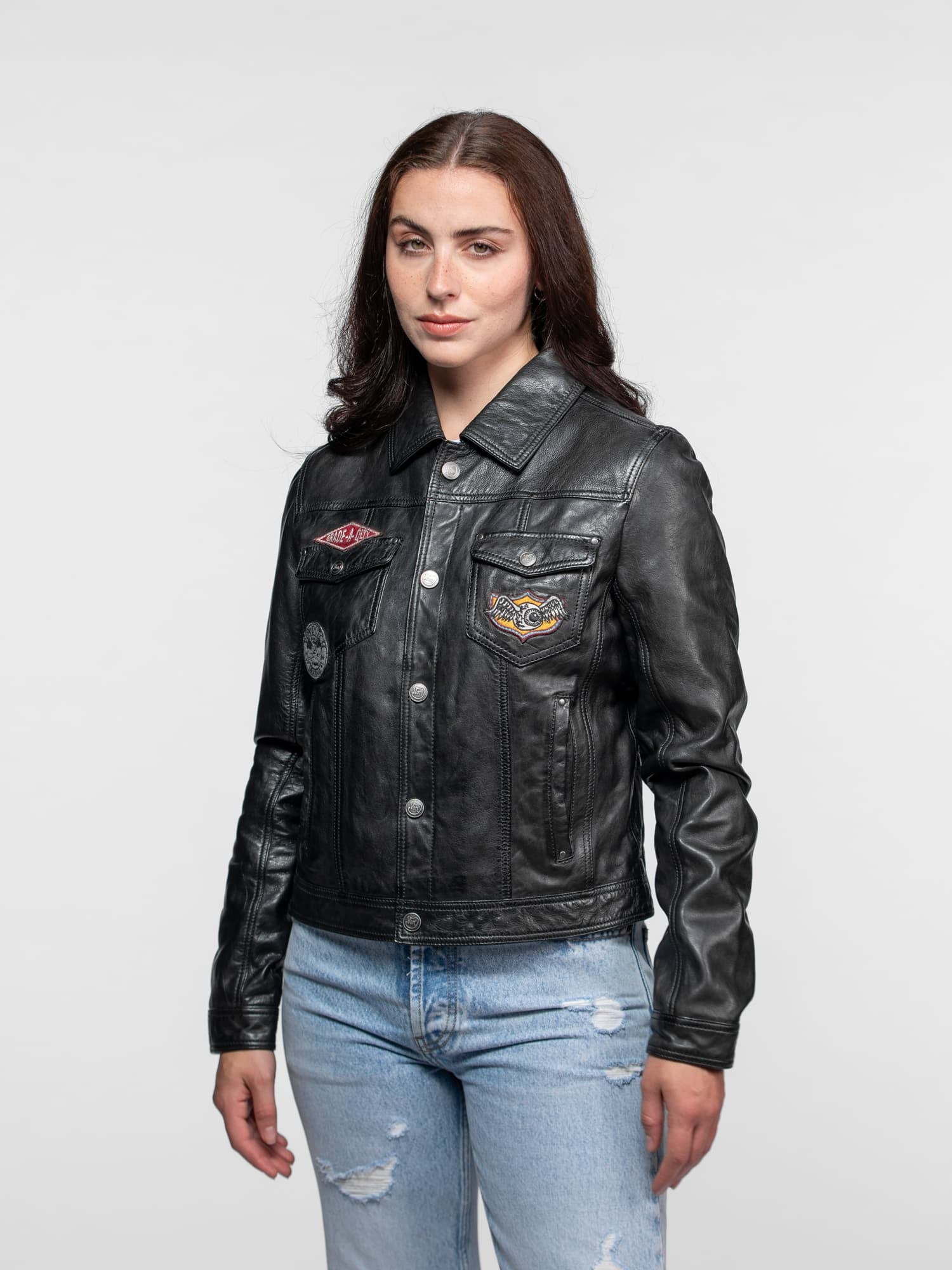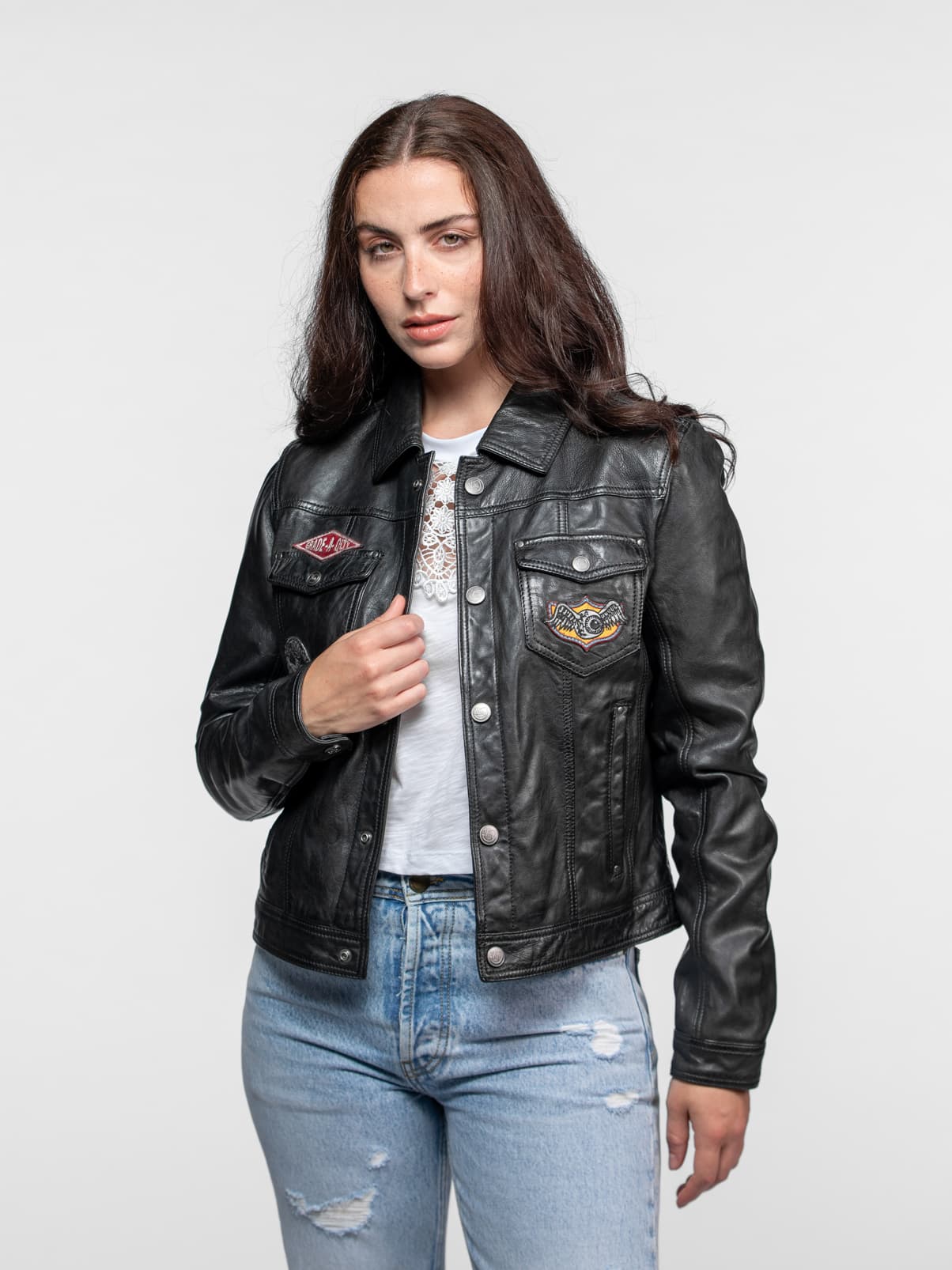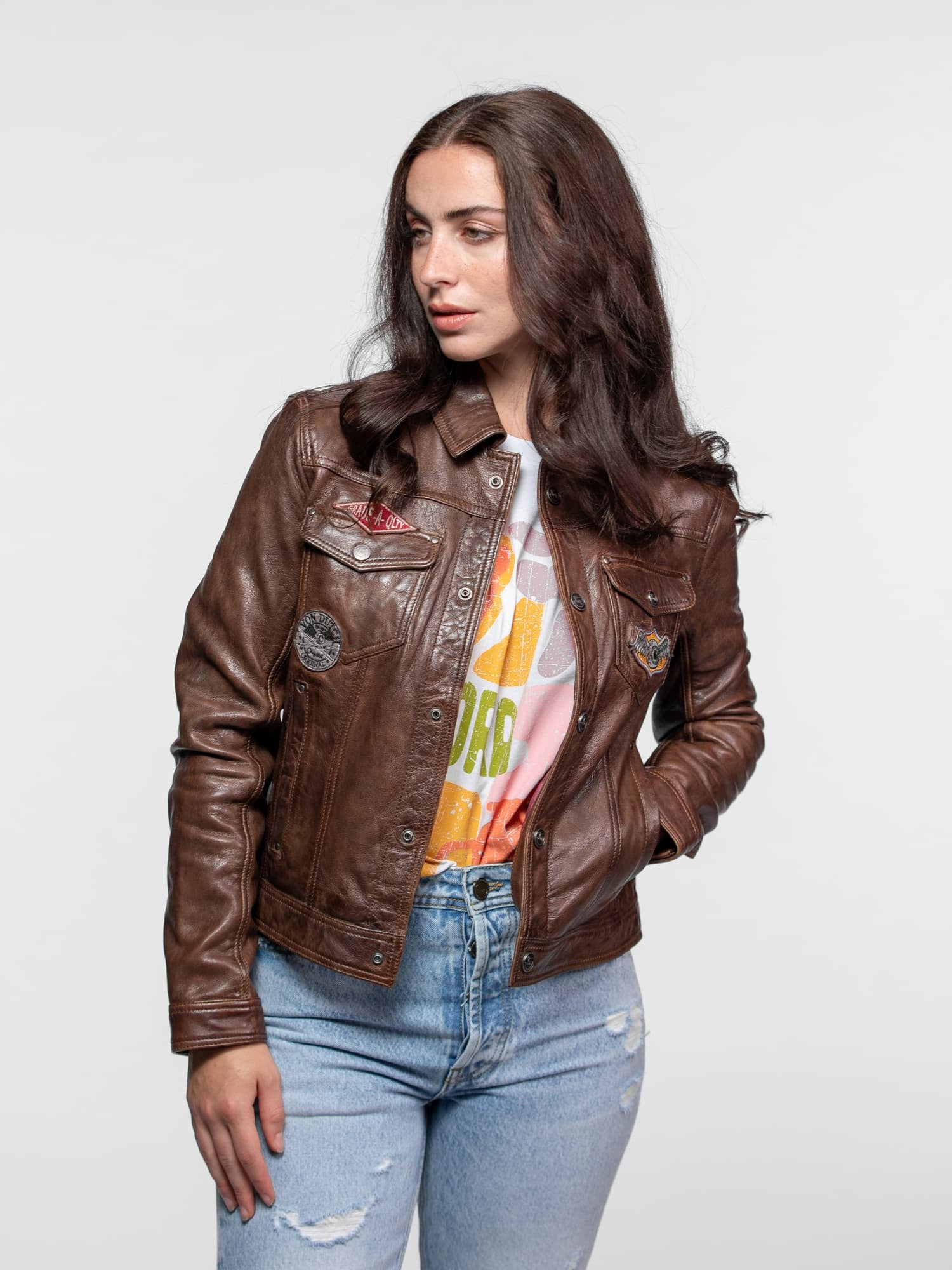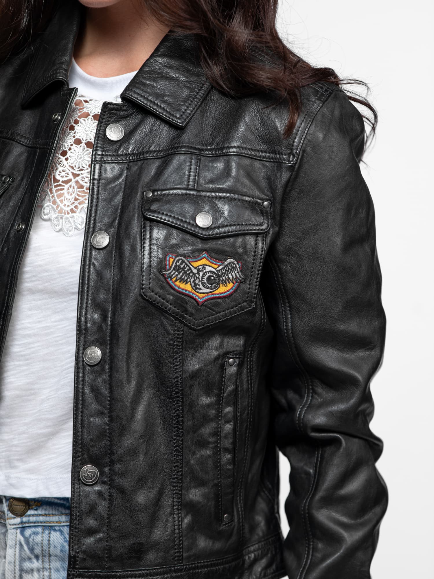 Ce modèle reprend la coupe trucker des vestes en jean. Cette version est fabriquée dans un cuir d'agneau lavé épais auquel des patchs brodés de la marque "Von Dutch" viennent s'ajouter. Une pièce au style rétro et authentique avec sa fameuse fermeture en boutonnière et ses 2 poches plaquées à rabat.