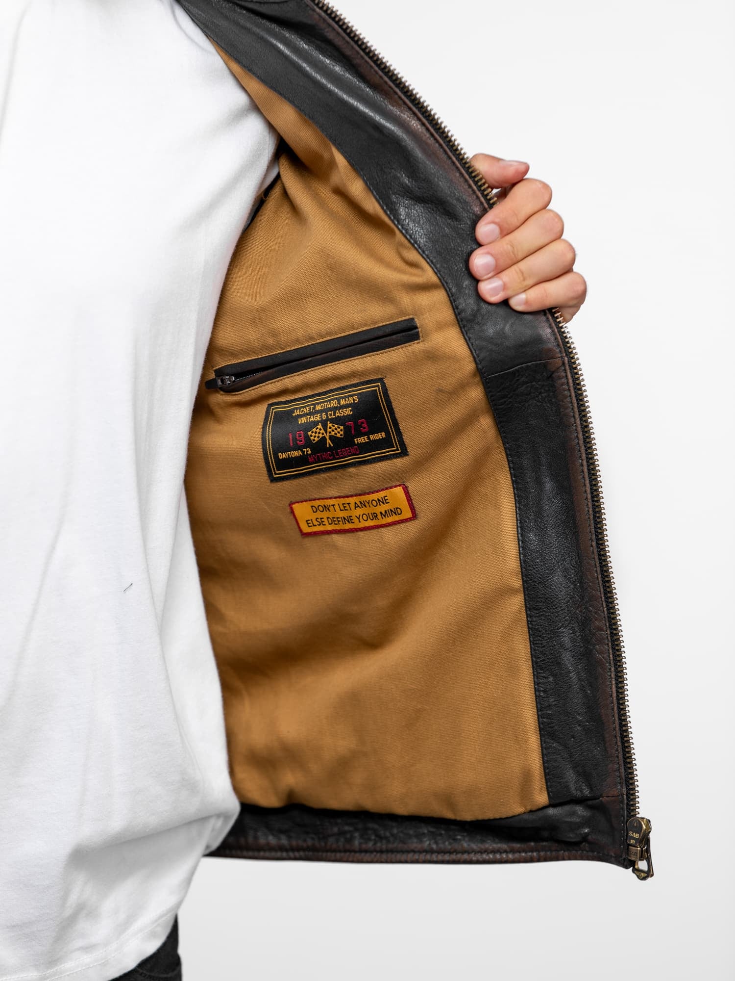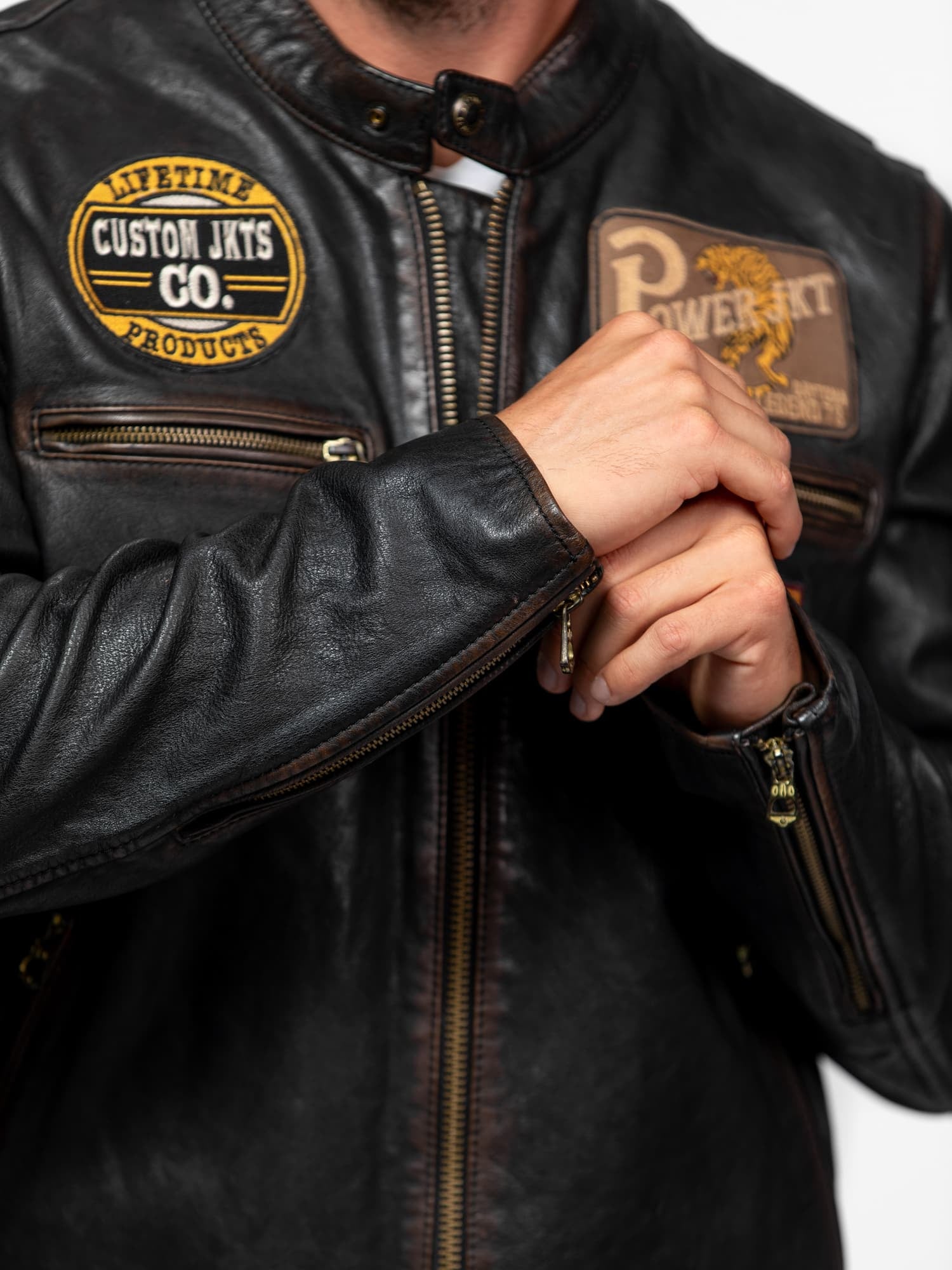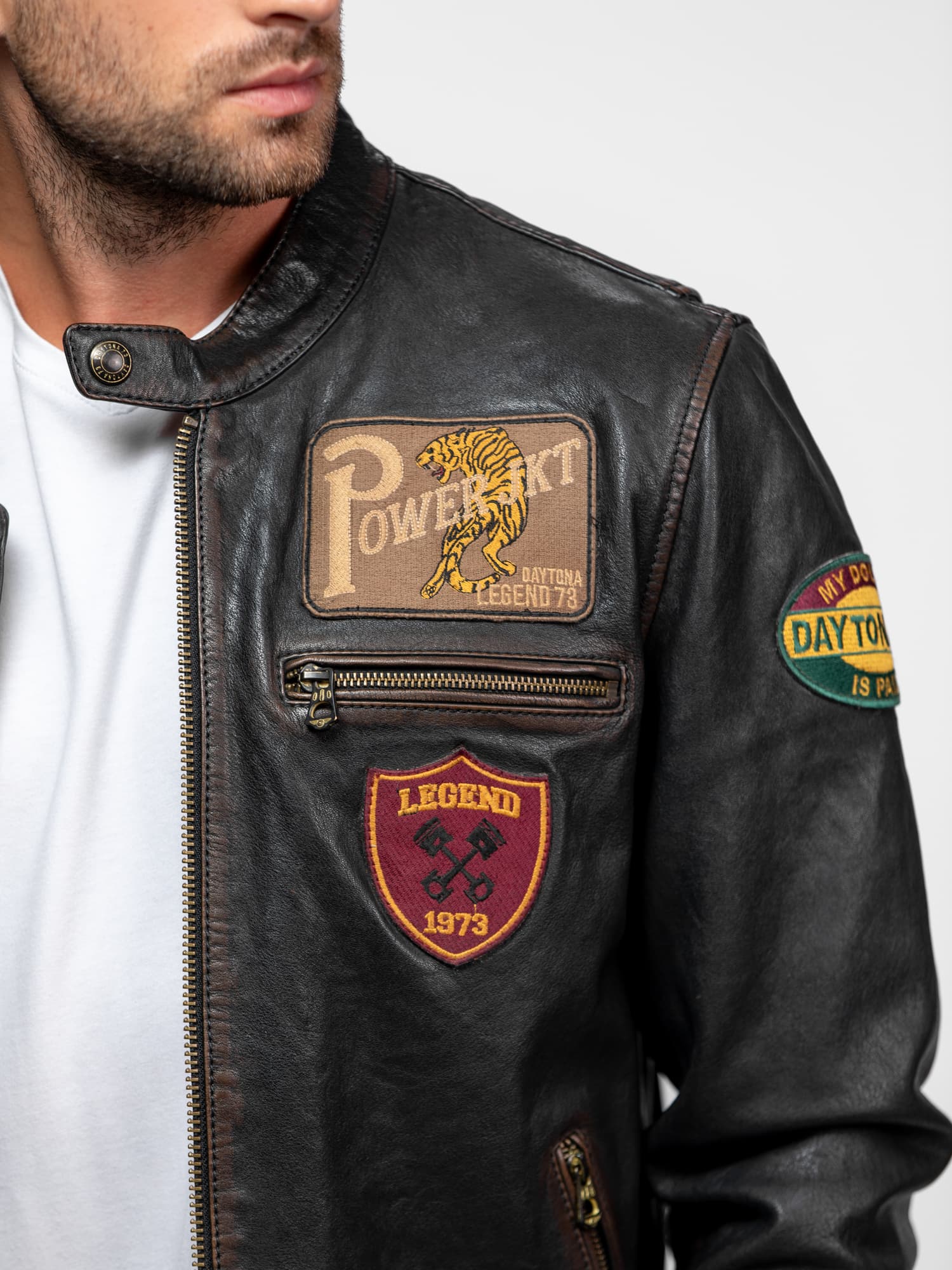 Véritable blouson de caractère, ce modèle a été fabriqué dans un cuir d'agneau vieilli avec des patchs brodés au style vintage. Devenu un modèle iconique pour sa patine unique, ce blouson possède une coupe ajustée et sera probablement le coupe de cœur de votre vestiaire.