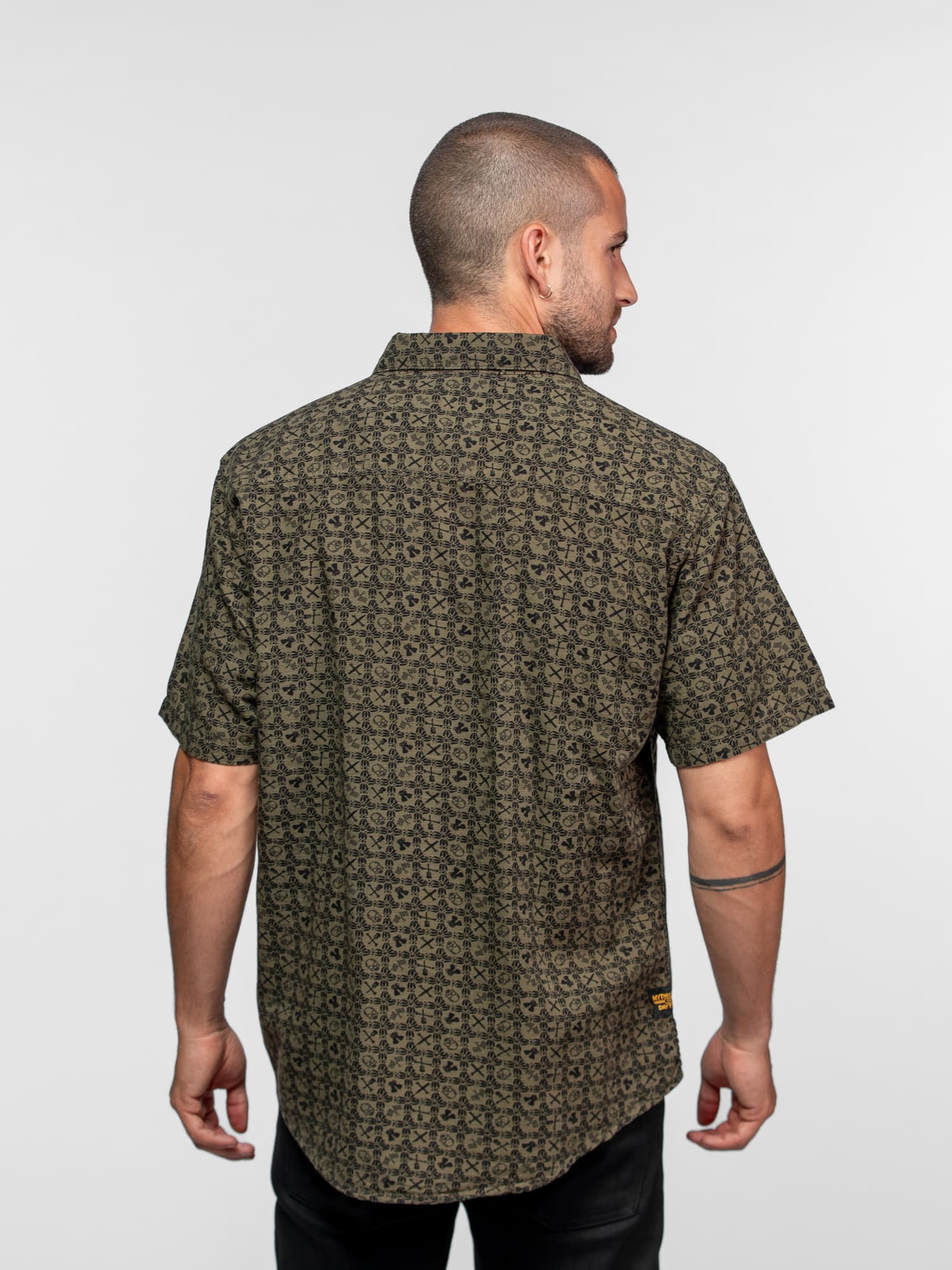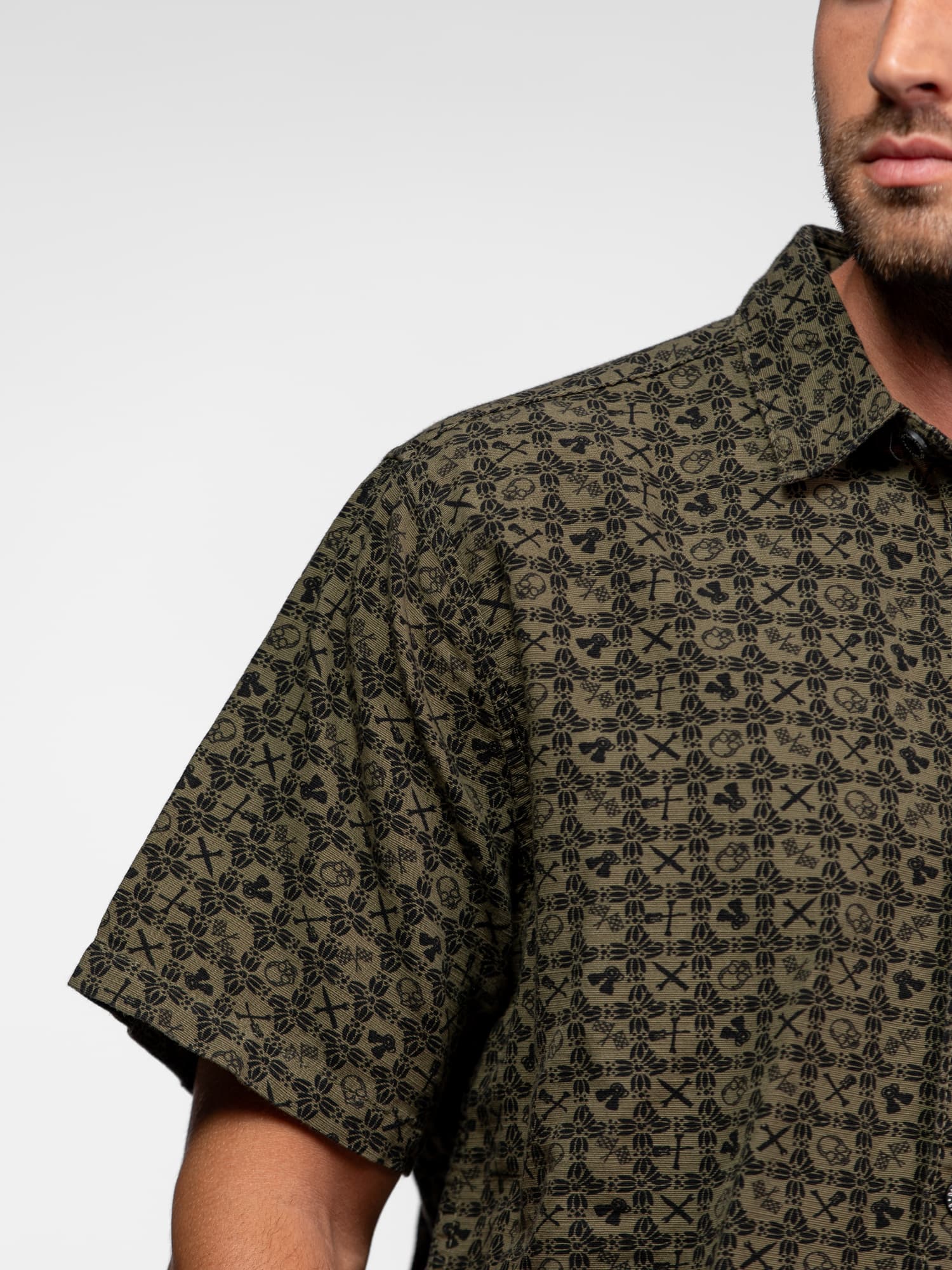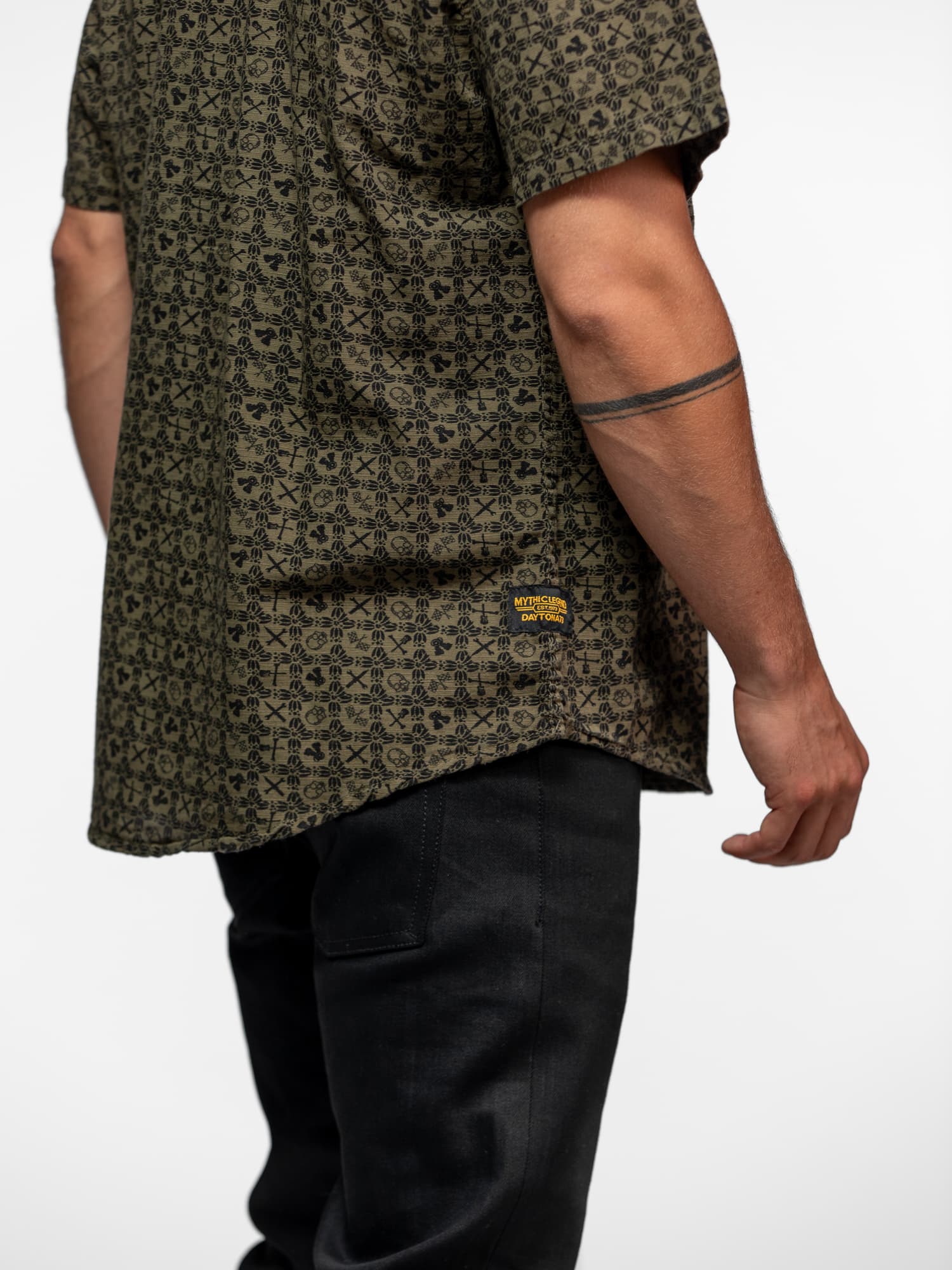 Cette chemise d'été reprend des motifs personnalisés issus de la culture ride. Elle est fabriquée dans un tissu de coton chanvre, une matière résistante à la chaleur et absorbante qui est entièrement biodégradable.