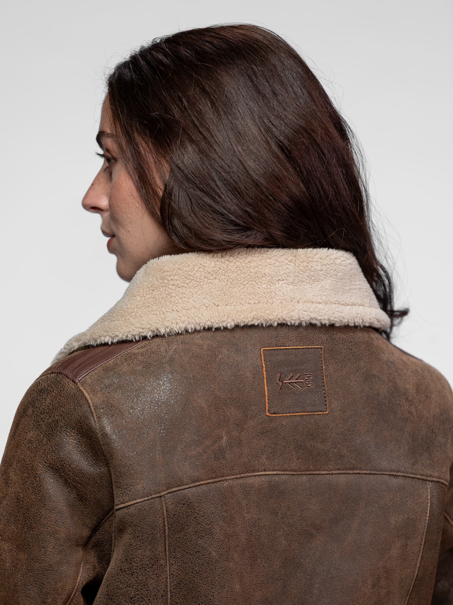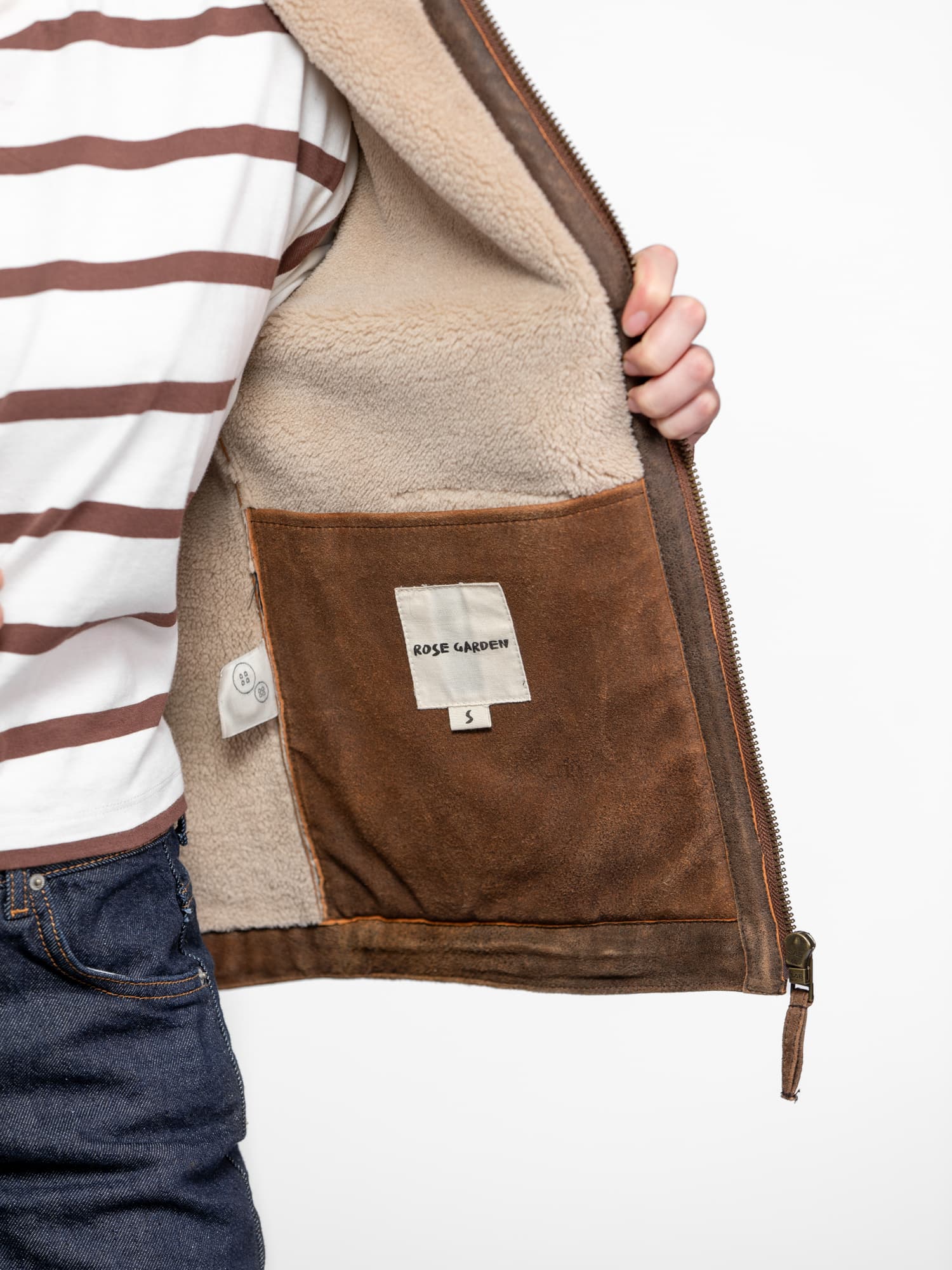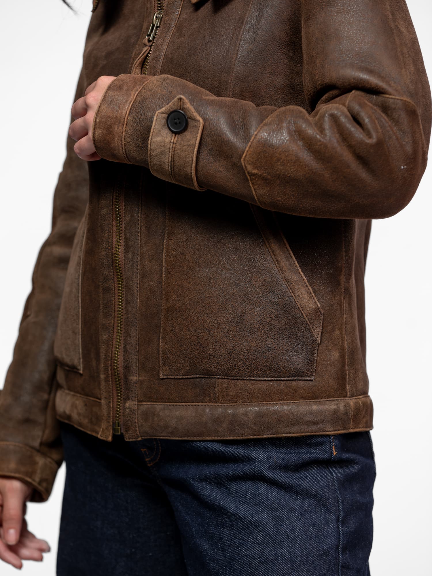 Bombardier en cuir de mouton effet vieilli, doublé en sherpa pour un confort chaud et moelleux. Son col large doublé, ses sangles ajustables et ses grandes poches en font une pièce à la fois pratique et intemporelle.