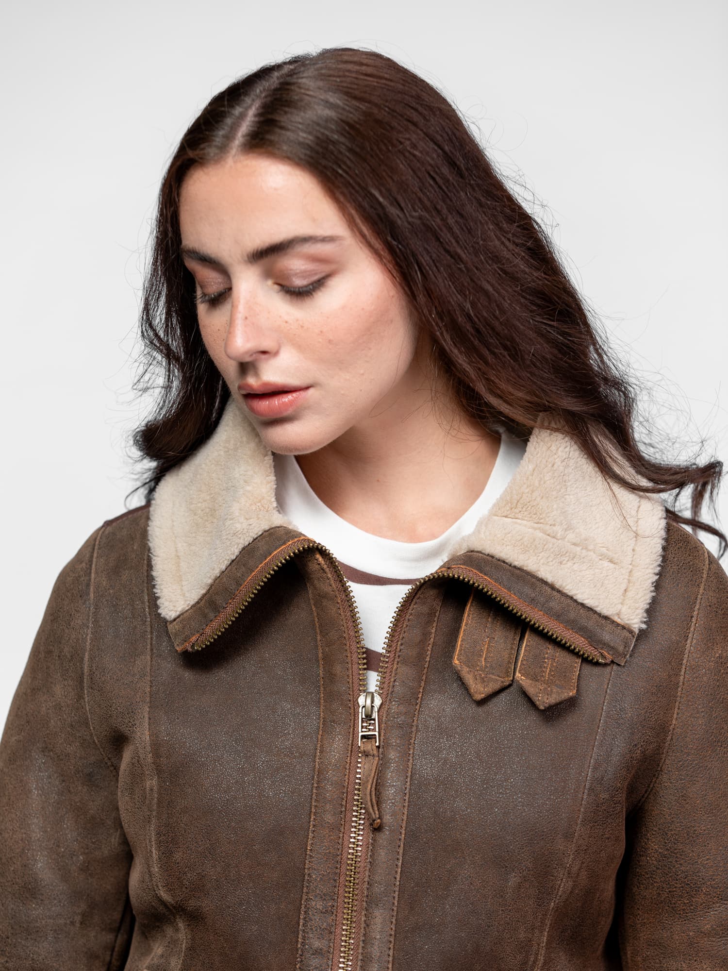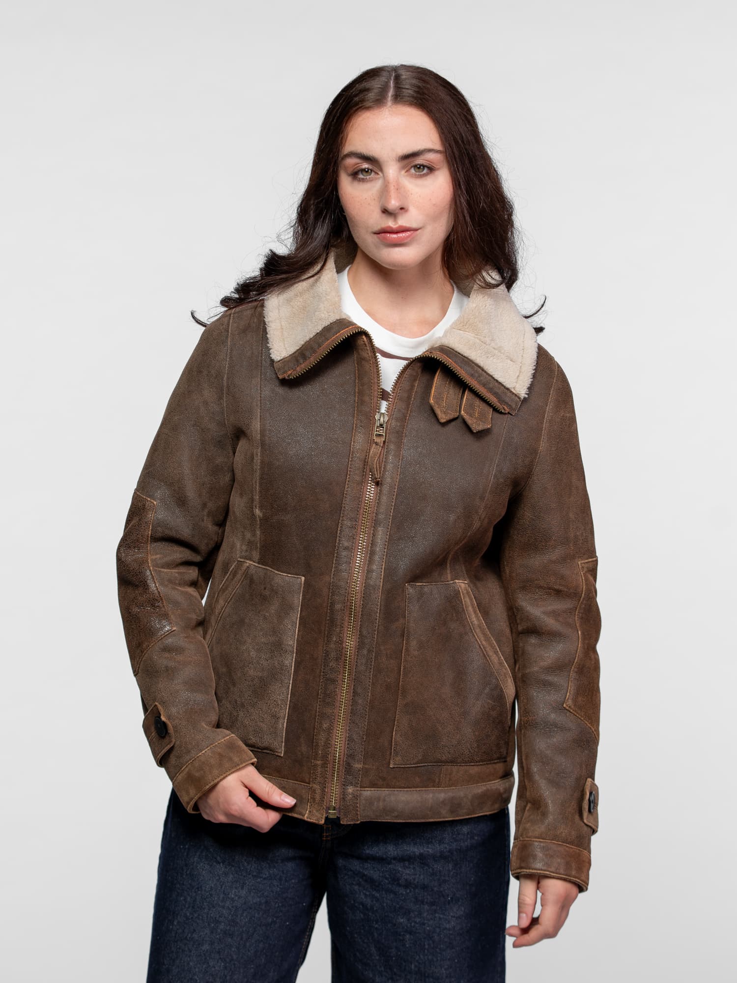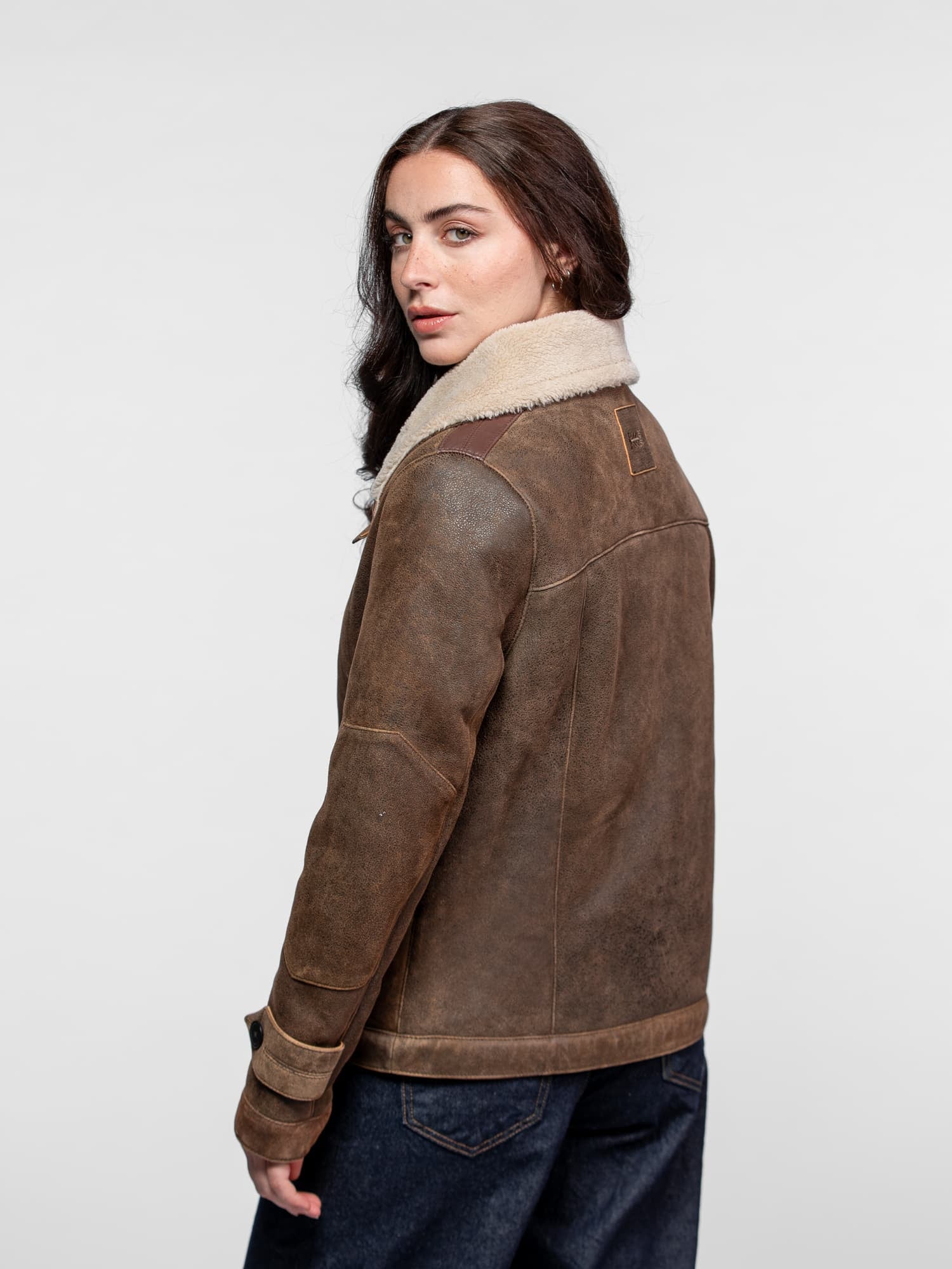 Bombardier en cuir de mouton effet vieilli, doublé en sherpa pour un confort chaud et moelleux. Son col large doublé, ses sangles ajustables et ses grandes poches en font une pièce à la fois pratique et intemporelle.
