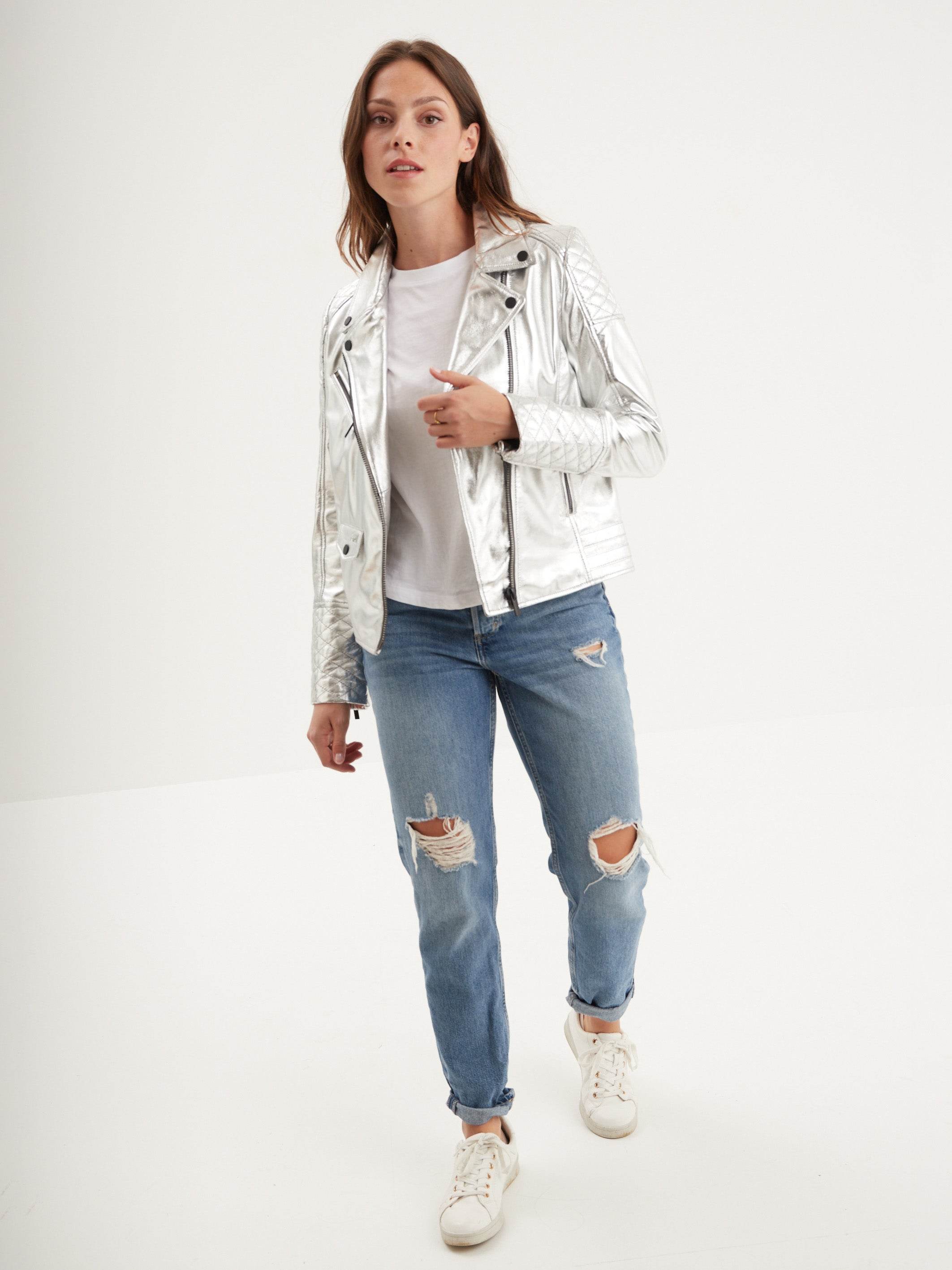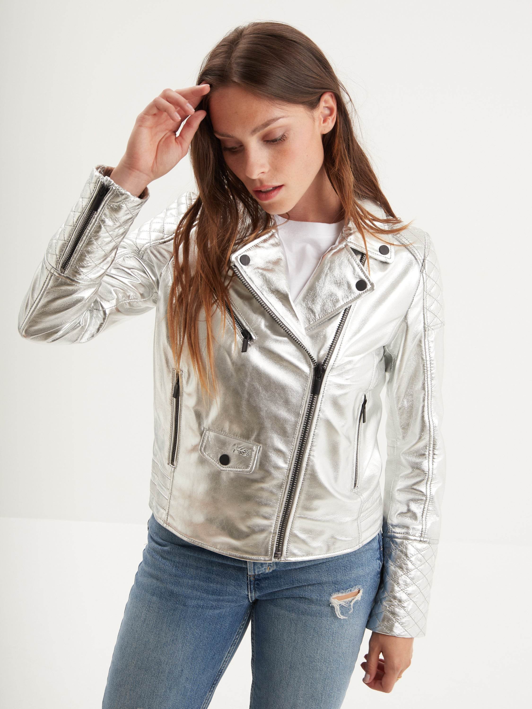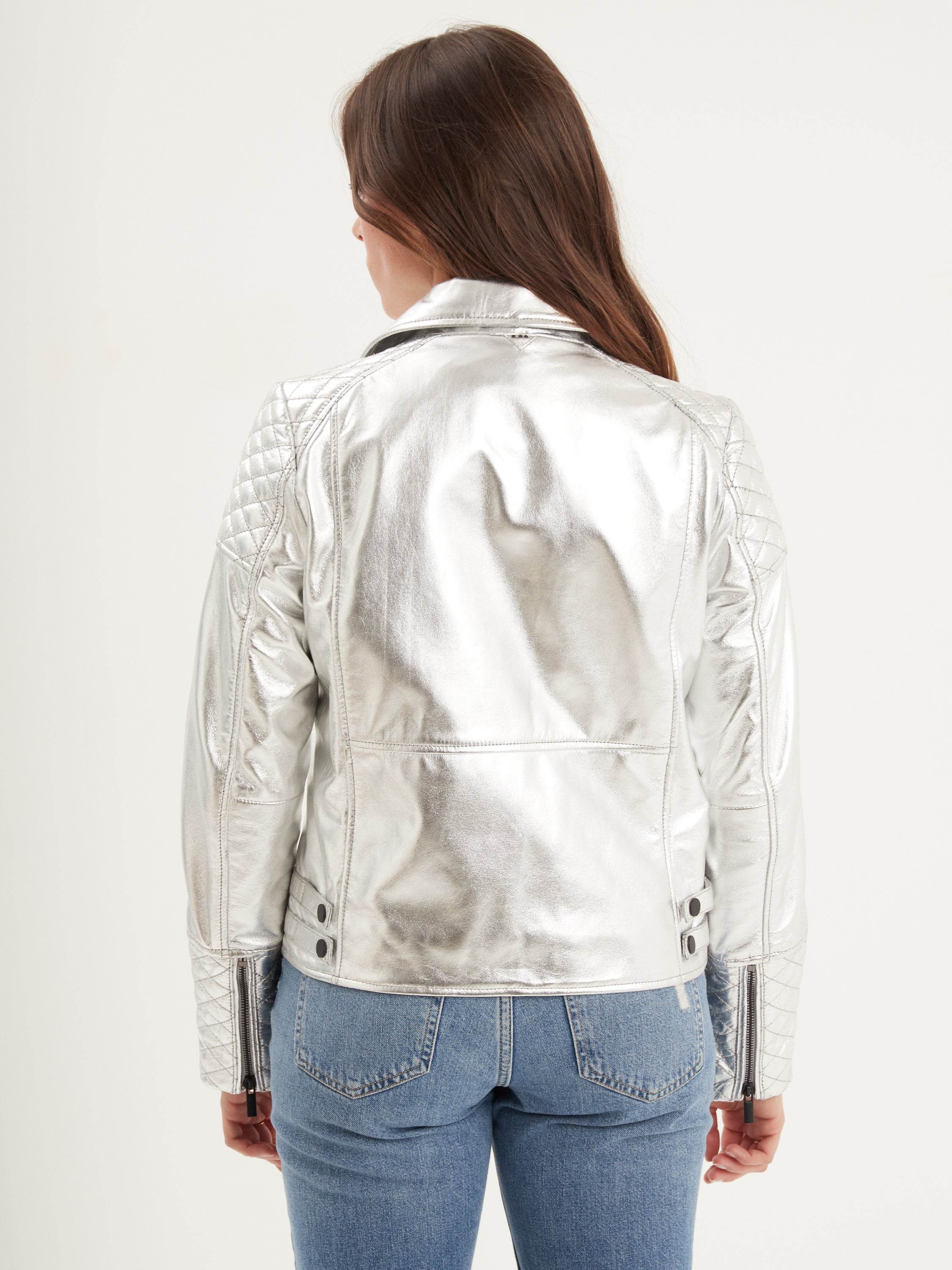 Osez l'audace avec ce blouson biker en cuir d'agneau au look irrésistiblement chic ! Sa finition argentée scintillante ne manquera pas d'attirer les regards, ajoutant une note futuriste à un classique intemporel.