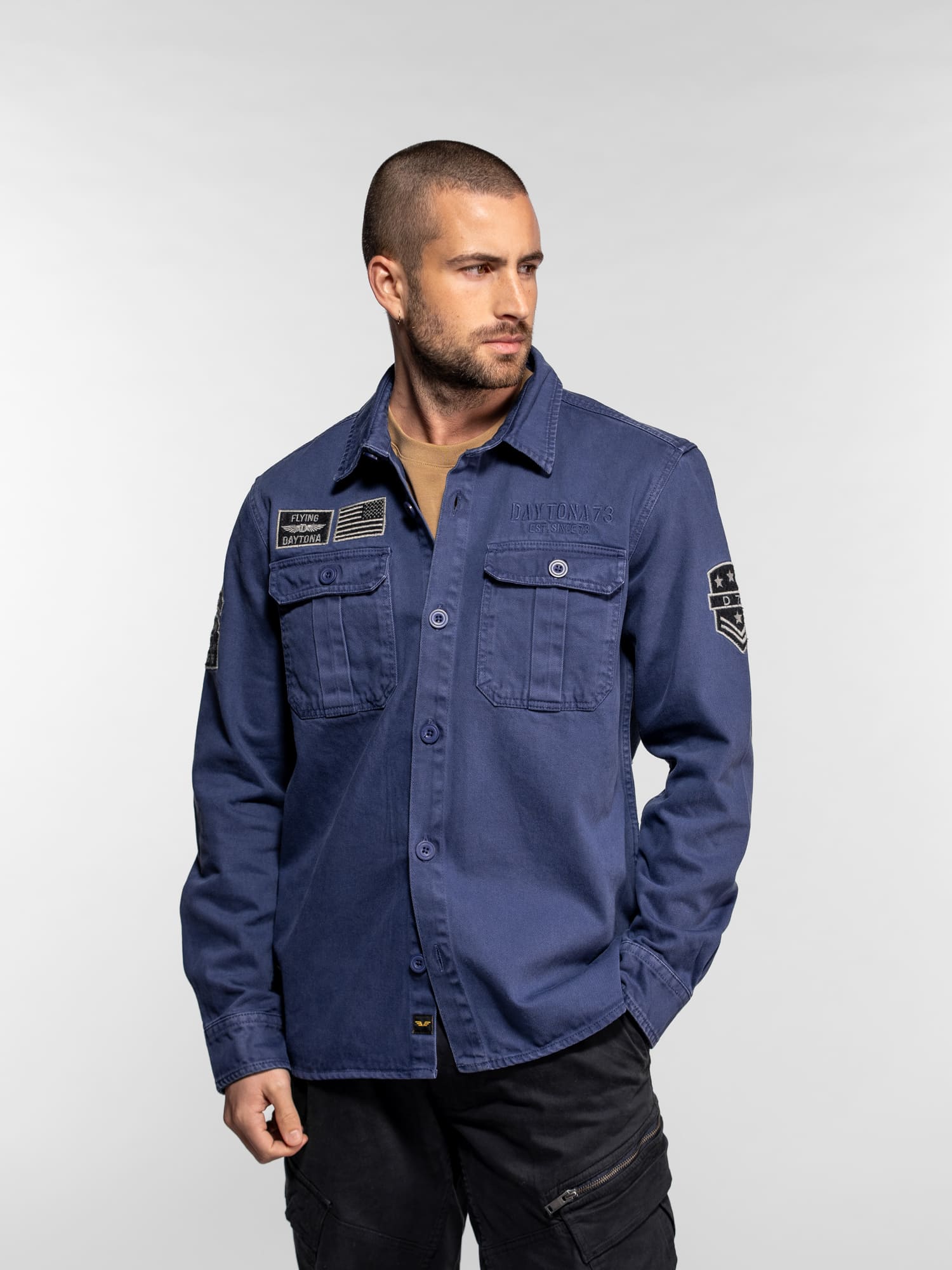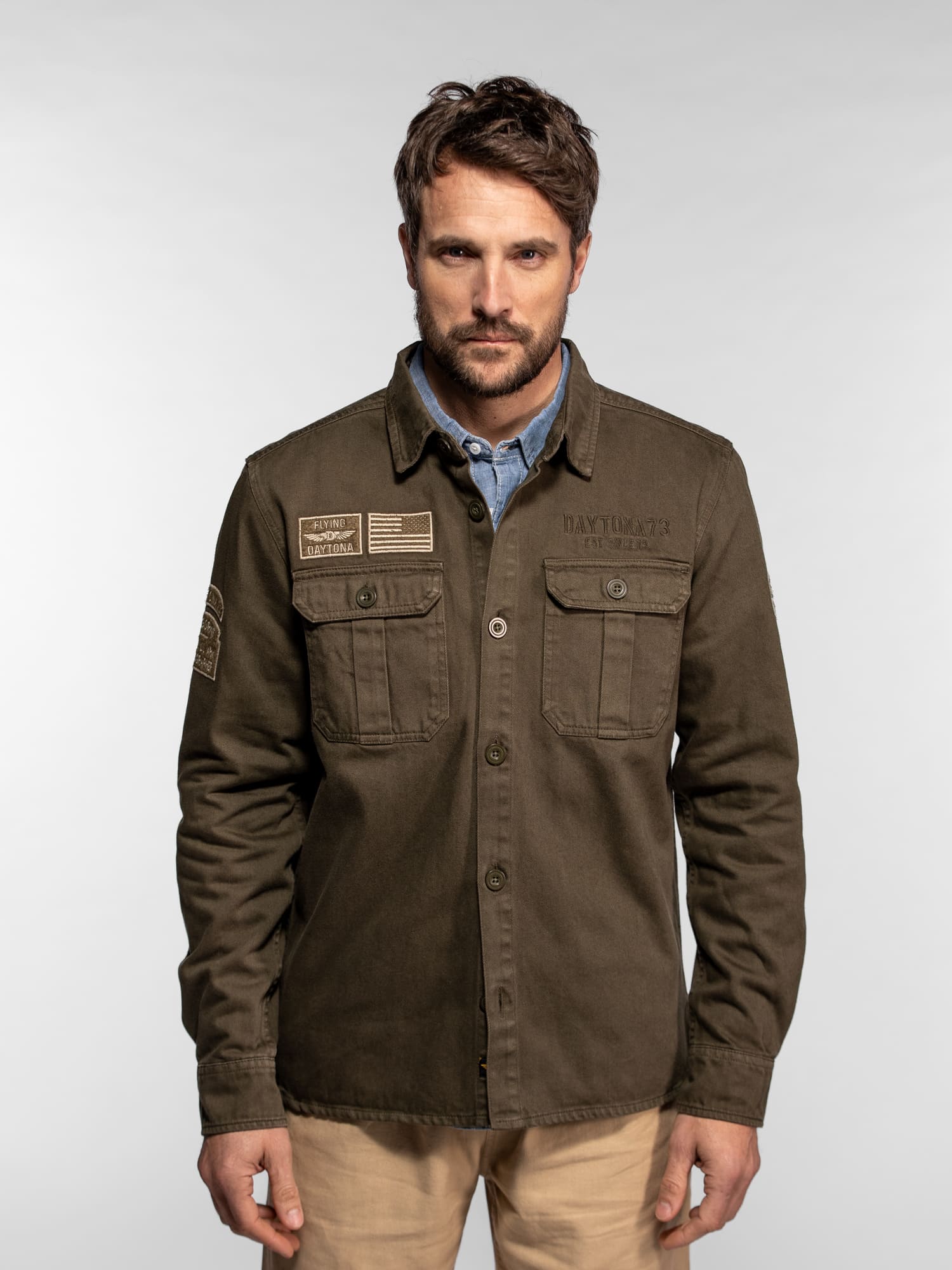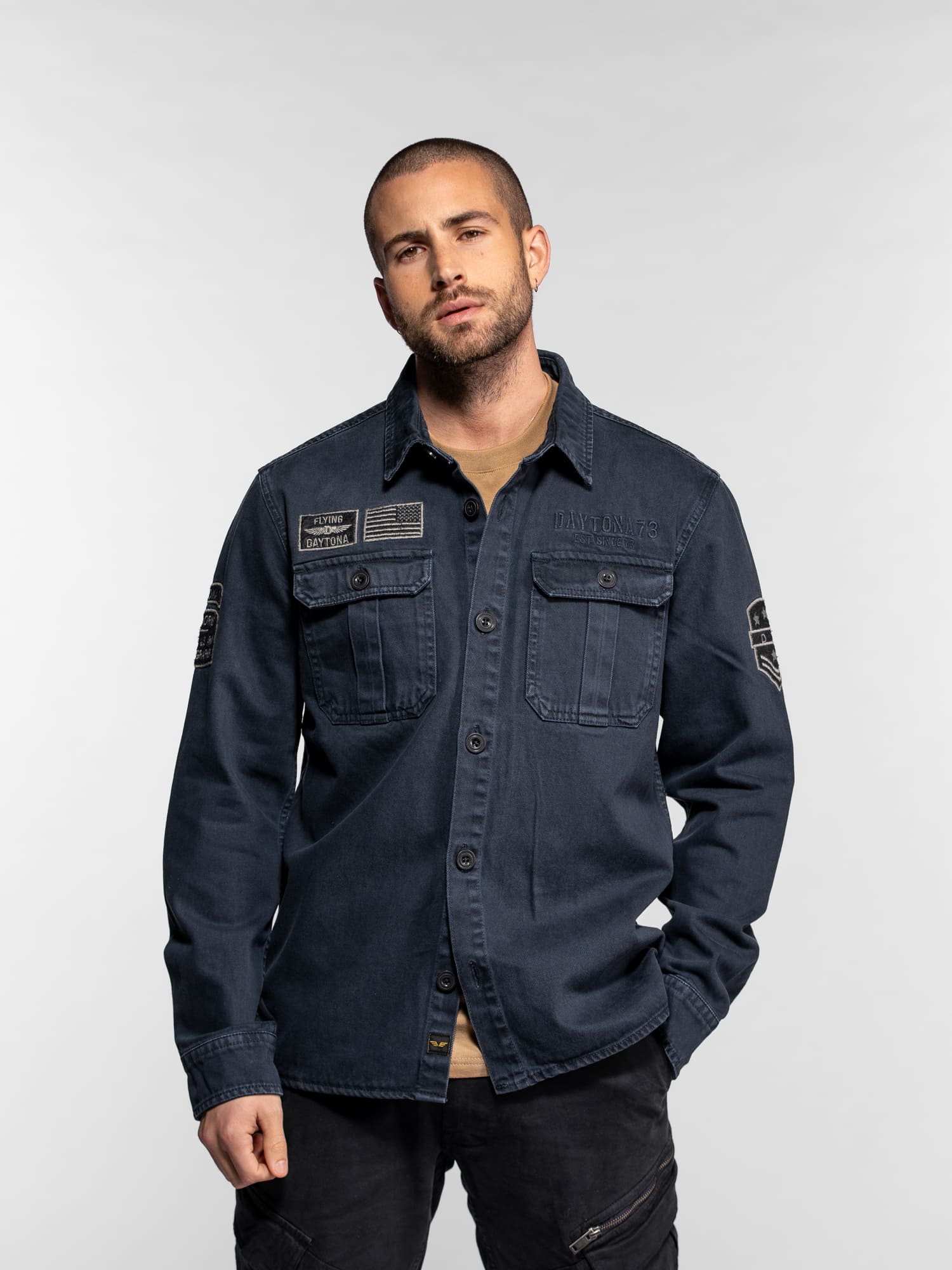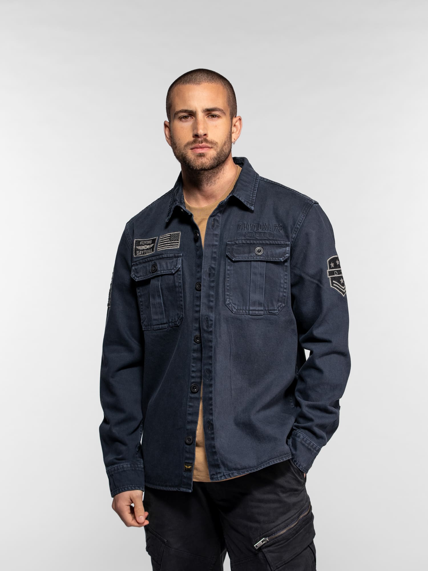 La surchemise Wayne en denim revisite l’esprit workwear avec une inspiration militaire affirmée. Confectionnée dans une toile bull denim résistante, elle se distingue par ses patchs brodés et ses détails authentiques qui reflètent l’ADN aventurier de DAYTONA 73. Un modèle de caractère, idéal à porter seul ou en superposition pour un look casual maîtrisé.