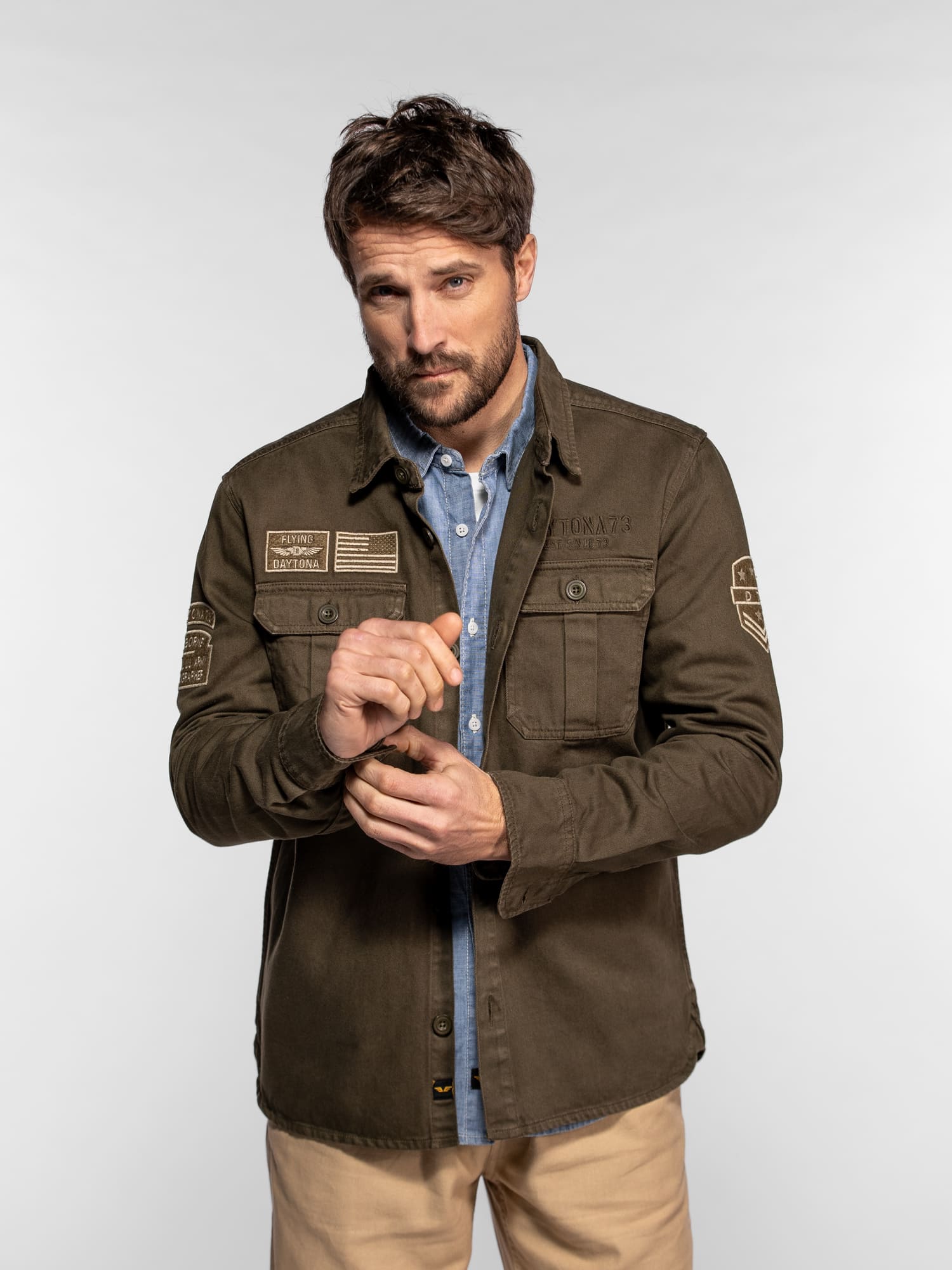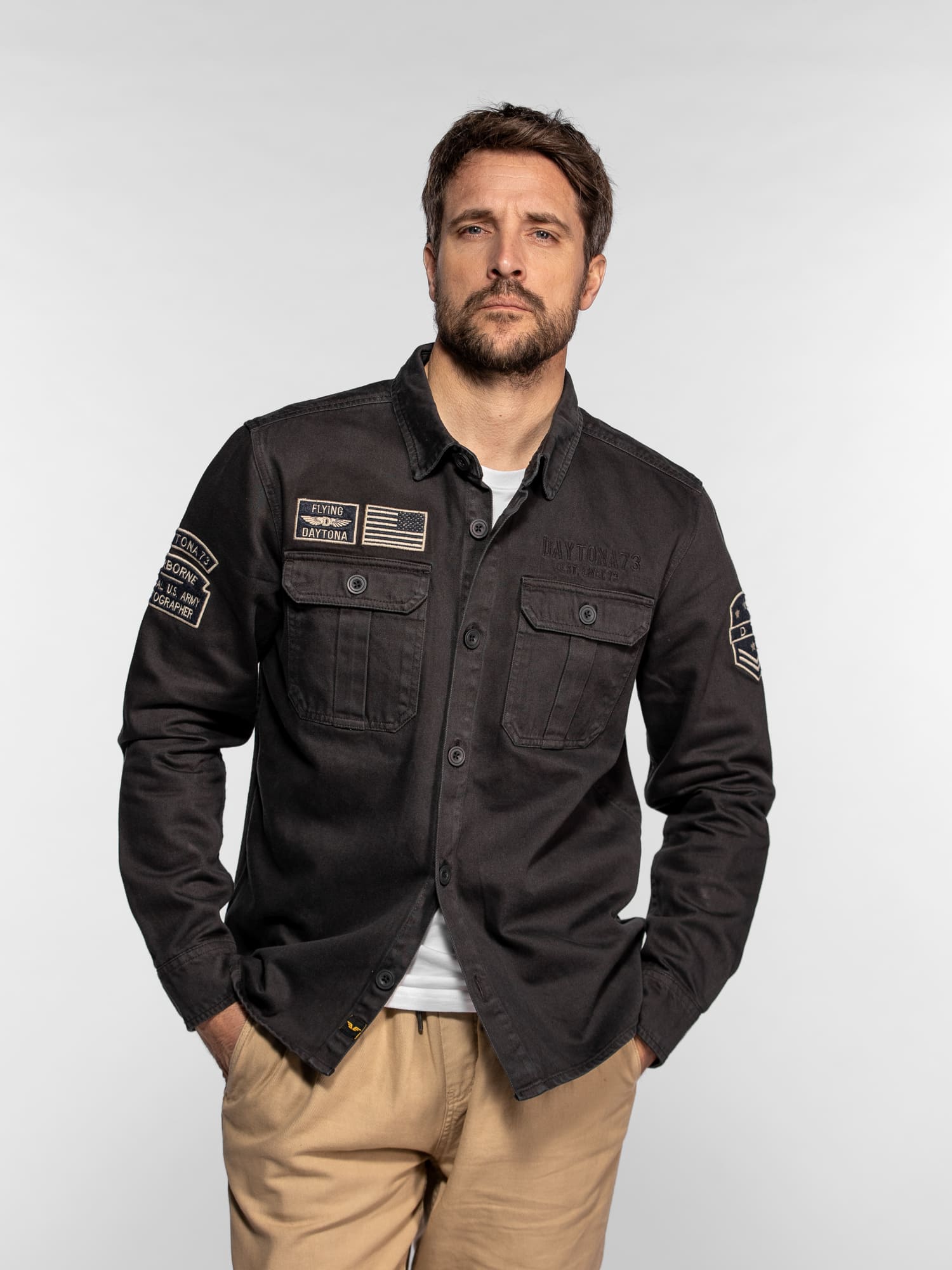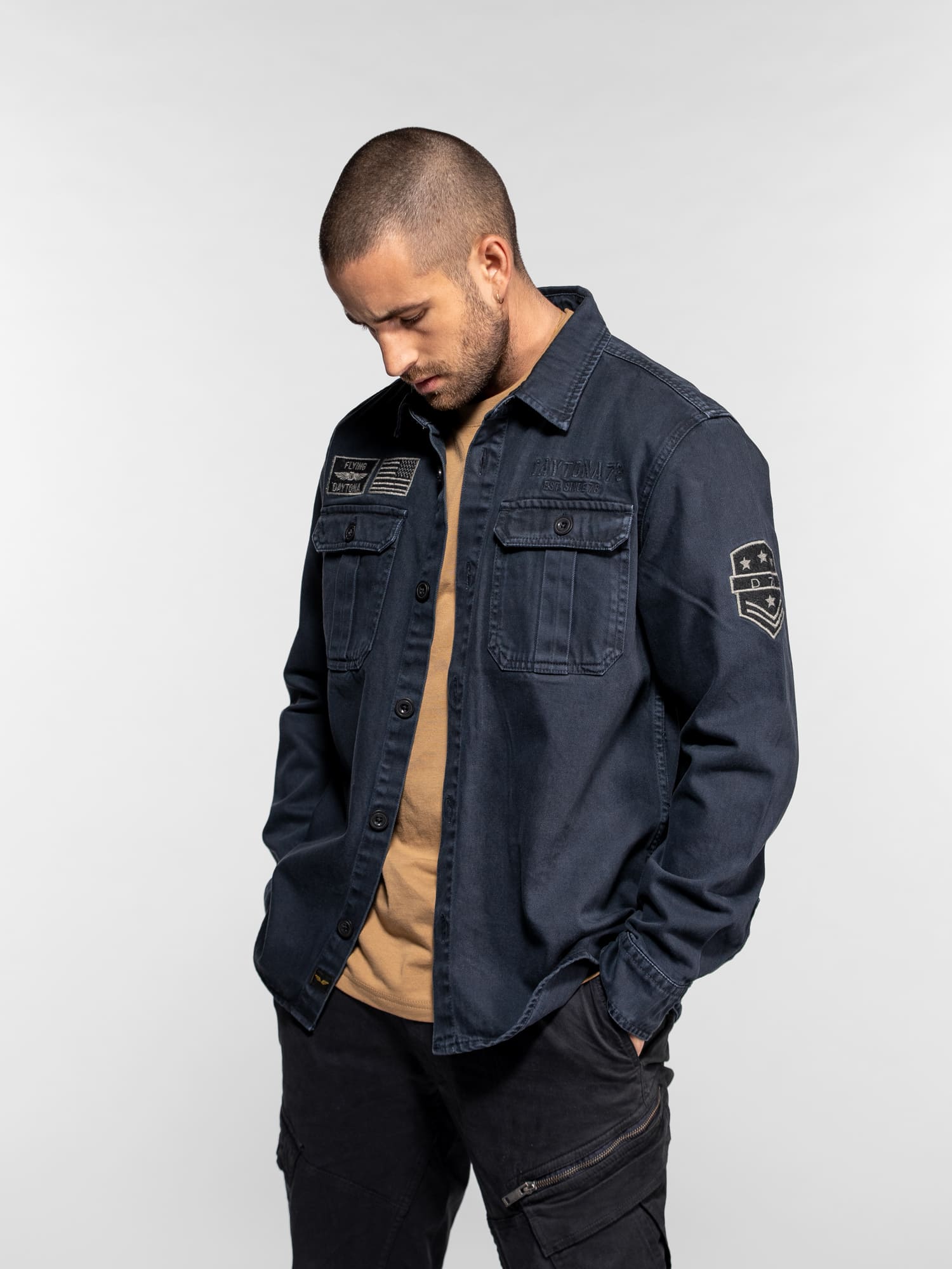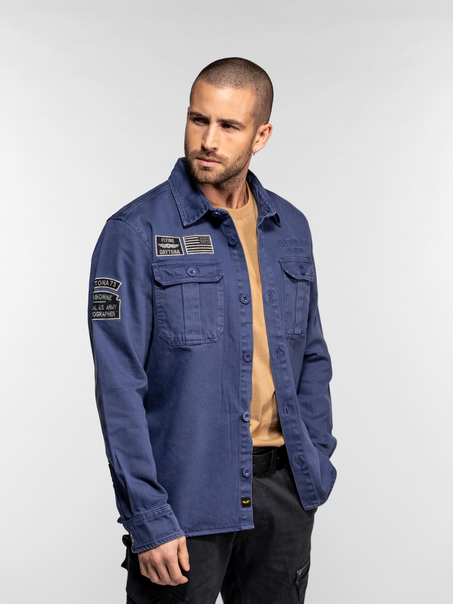 La surchemise Wayne en denim revisite l’esprit workwear avec une inspiration militaire affirmée. Confectionnée dans une toile bull denim résistante, elle se distingue par ses patchs brodés et ses détails authentiques qui reflètent l’ADN aventurier de DAYTONA 73. Un modèle de caractère, idéal à porter seul ou en superposition pour un look casual maîtrisé.