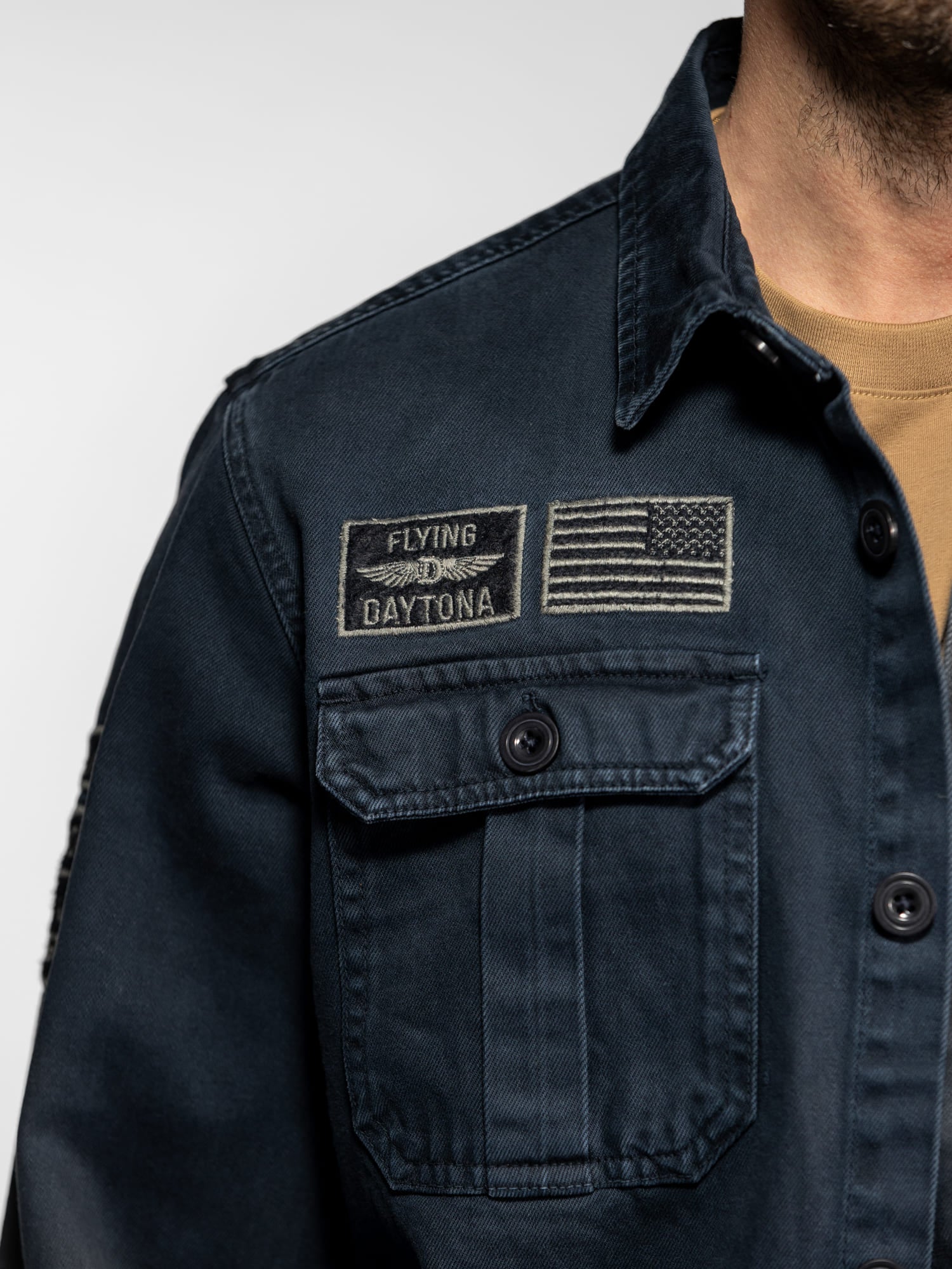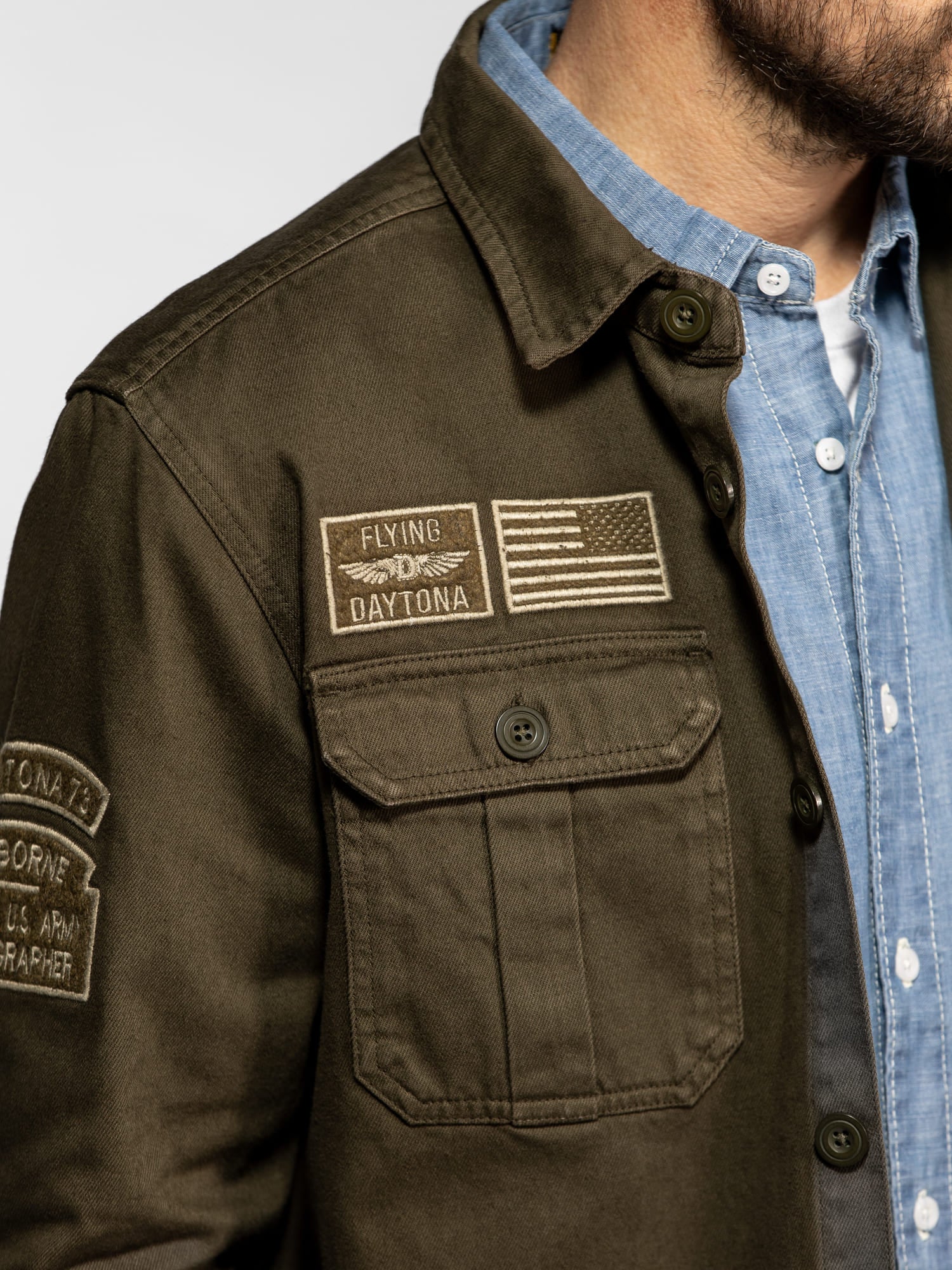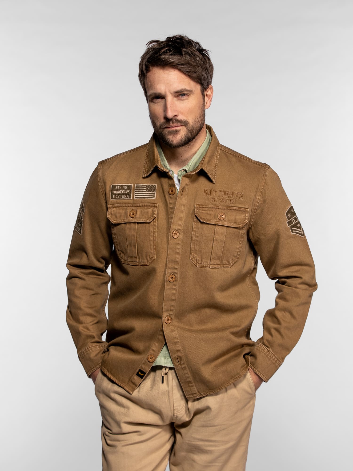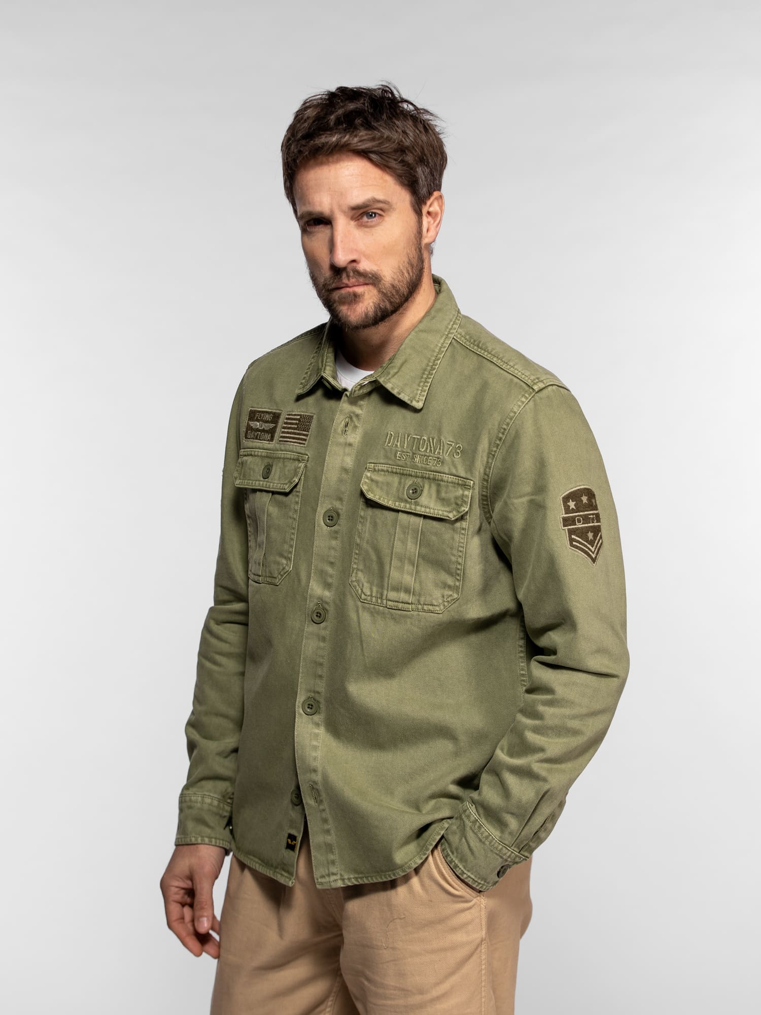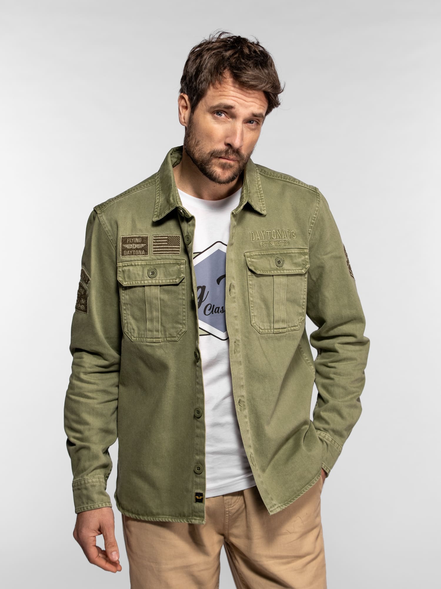 La surchemise Wayne en denim revisite l’esprit workwear avec une inspiration militaire affirmée. Confectionnée dans une toile bull denim résistante, elle se distingue par ses patchs brodés et ses détails authentiques qui reflètent l’ADN aventurier de DAYTONA 73. Un modèle de caractère, idéal à porter seul ou en superposition pour un look casual maîtrisé.