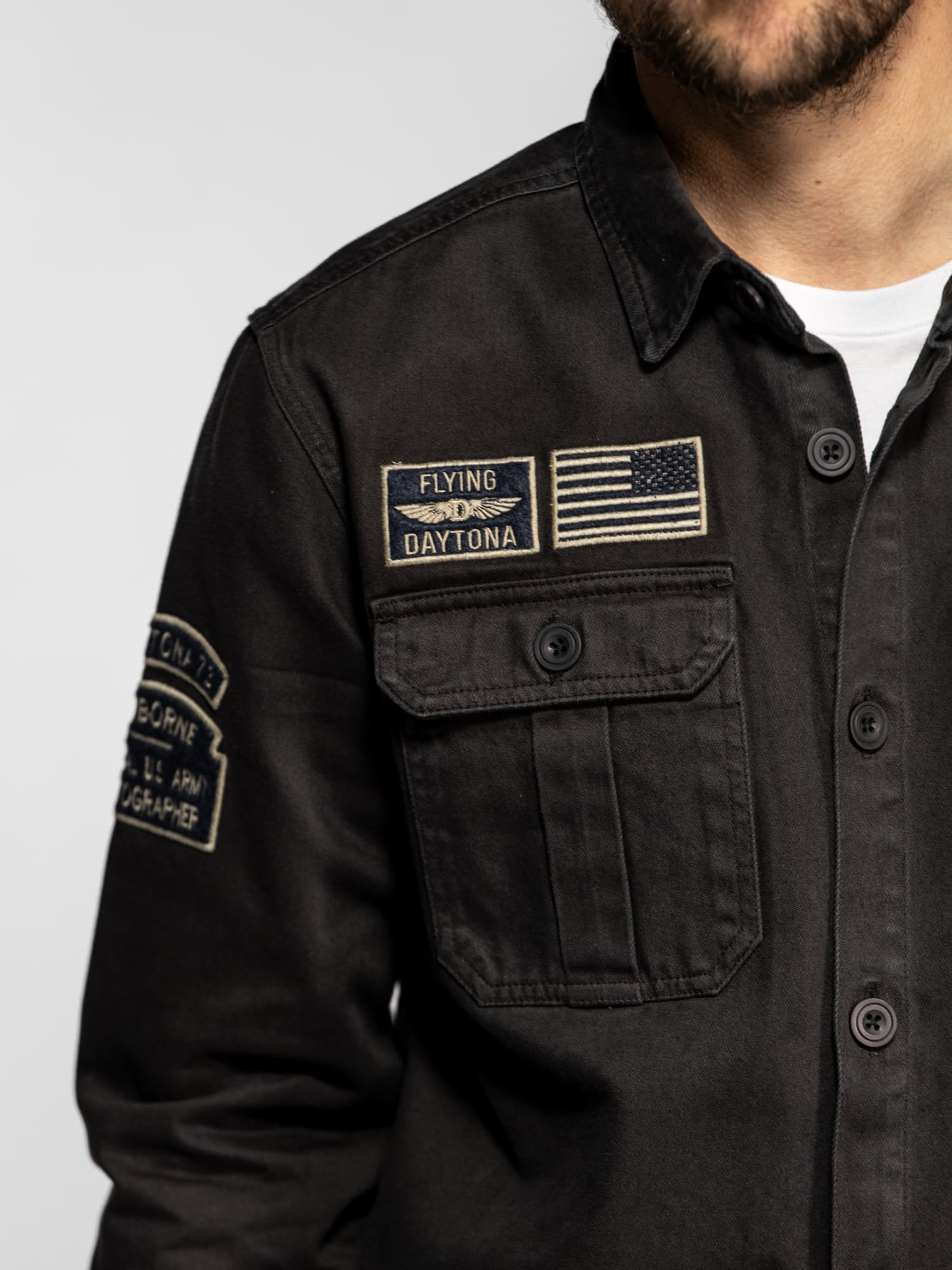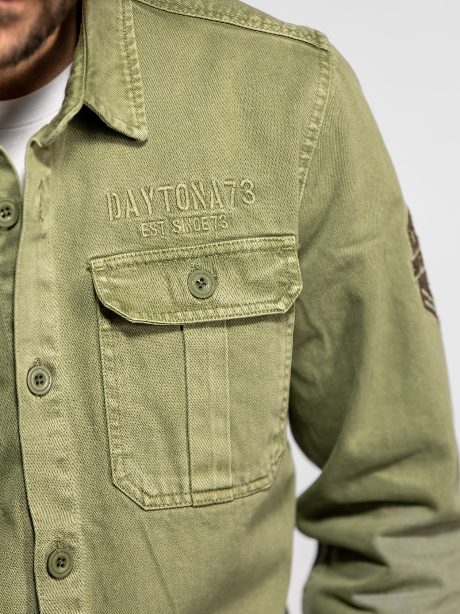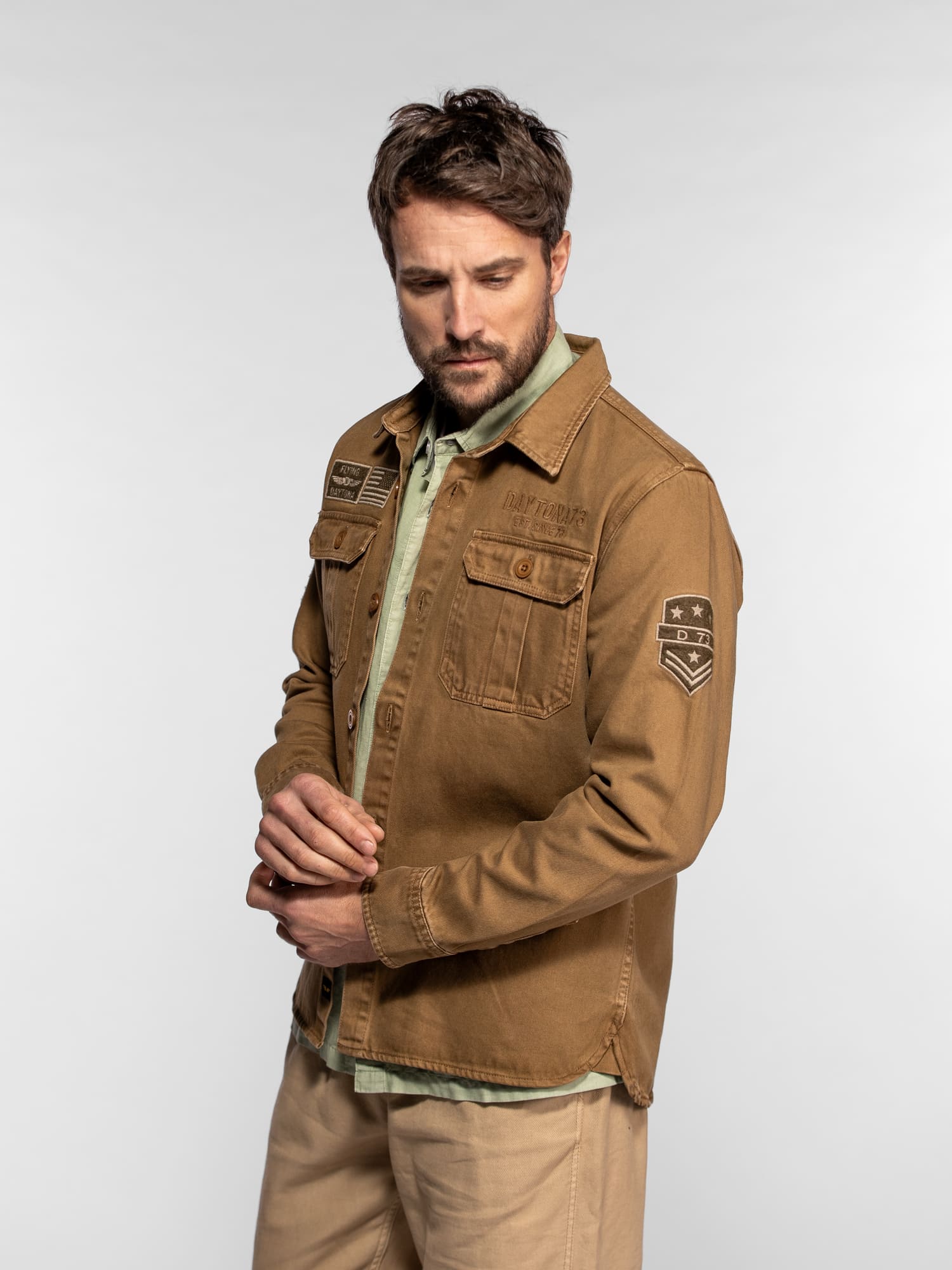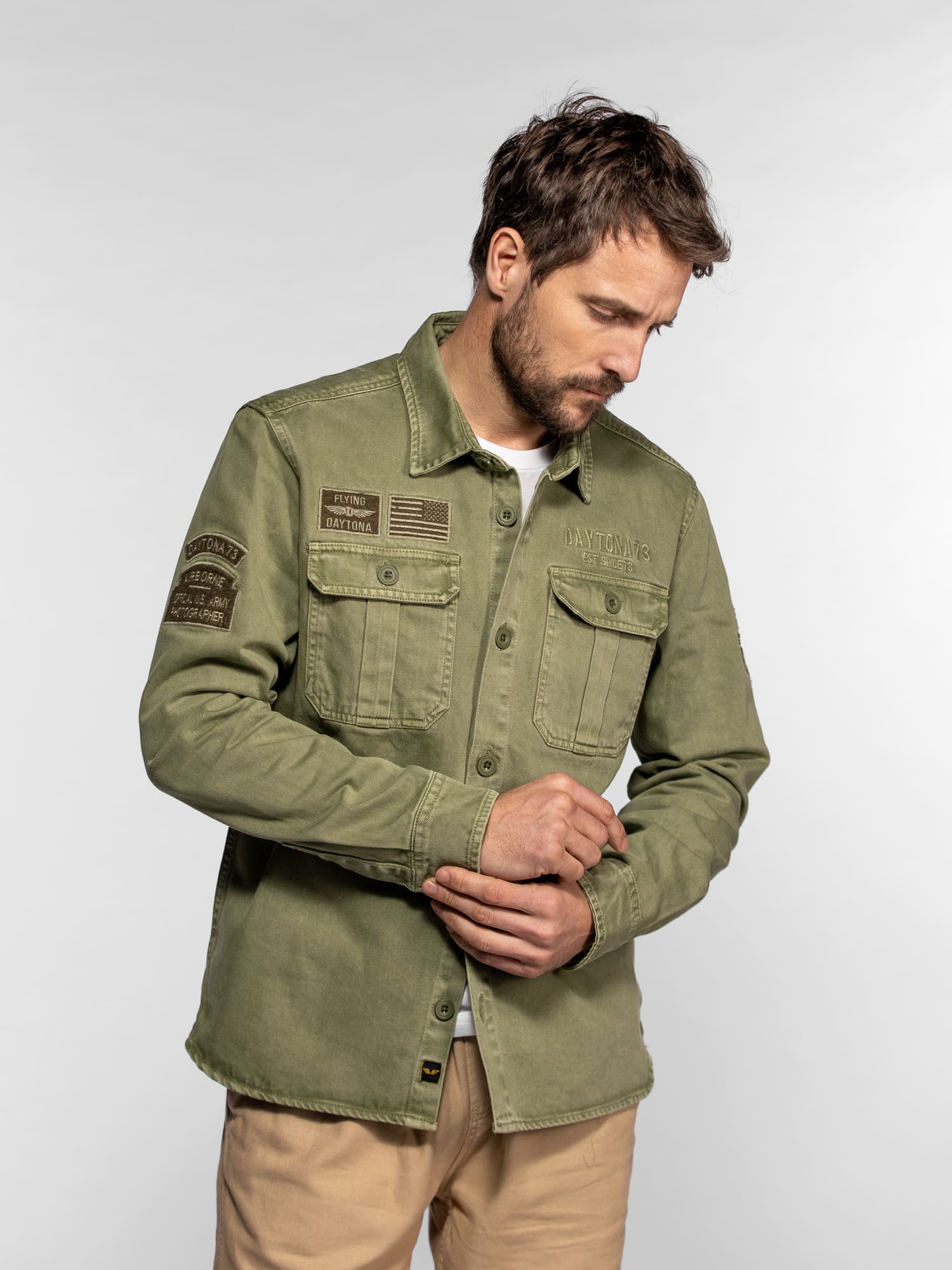 La surchemise Wayne en denim revisite l’esprit workwear avec une inspiration militaire affirmée. Confectionnée dans une toile bull denim résistante, elle se distingue par ses patchs brodés et ses détails authentiques qui reflètent l’ADN aventurier de DAYTONA 73. Un modèle de caractère, idéal à porter seul ou en superposition pour un look casual maîtrisé.