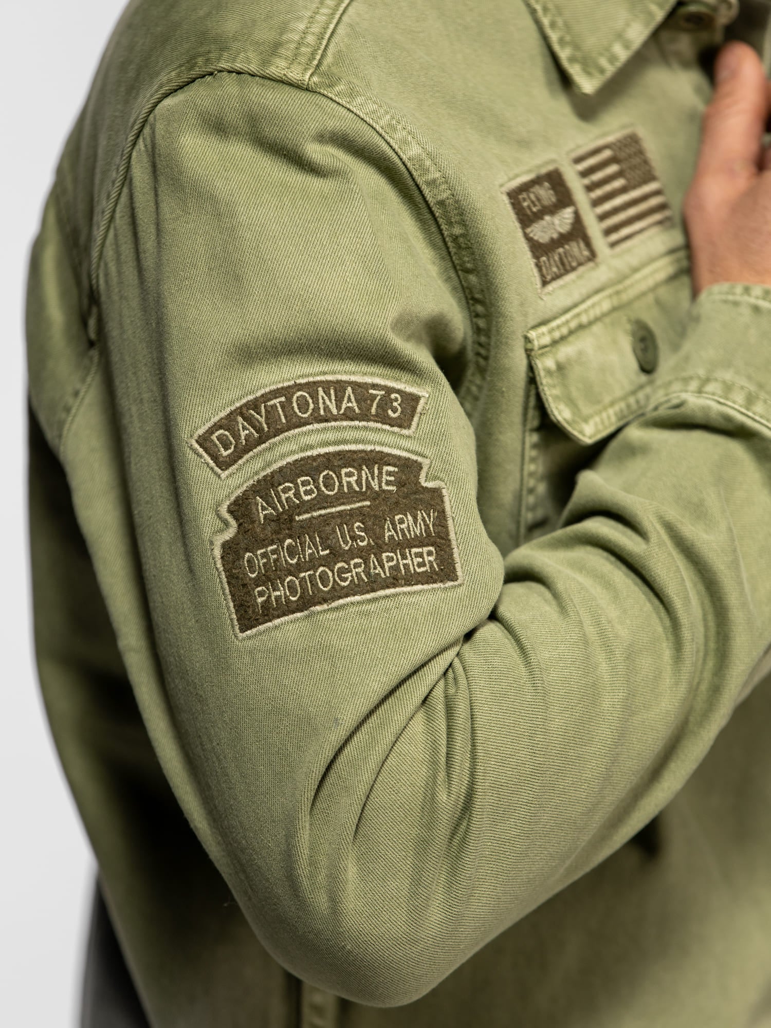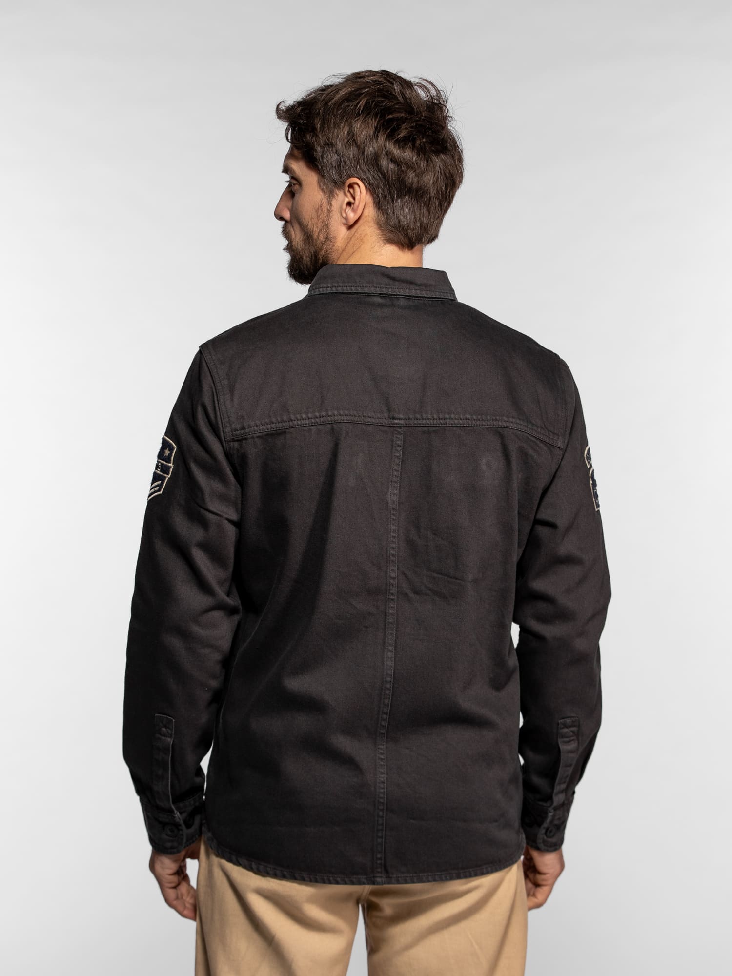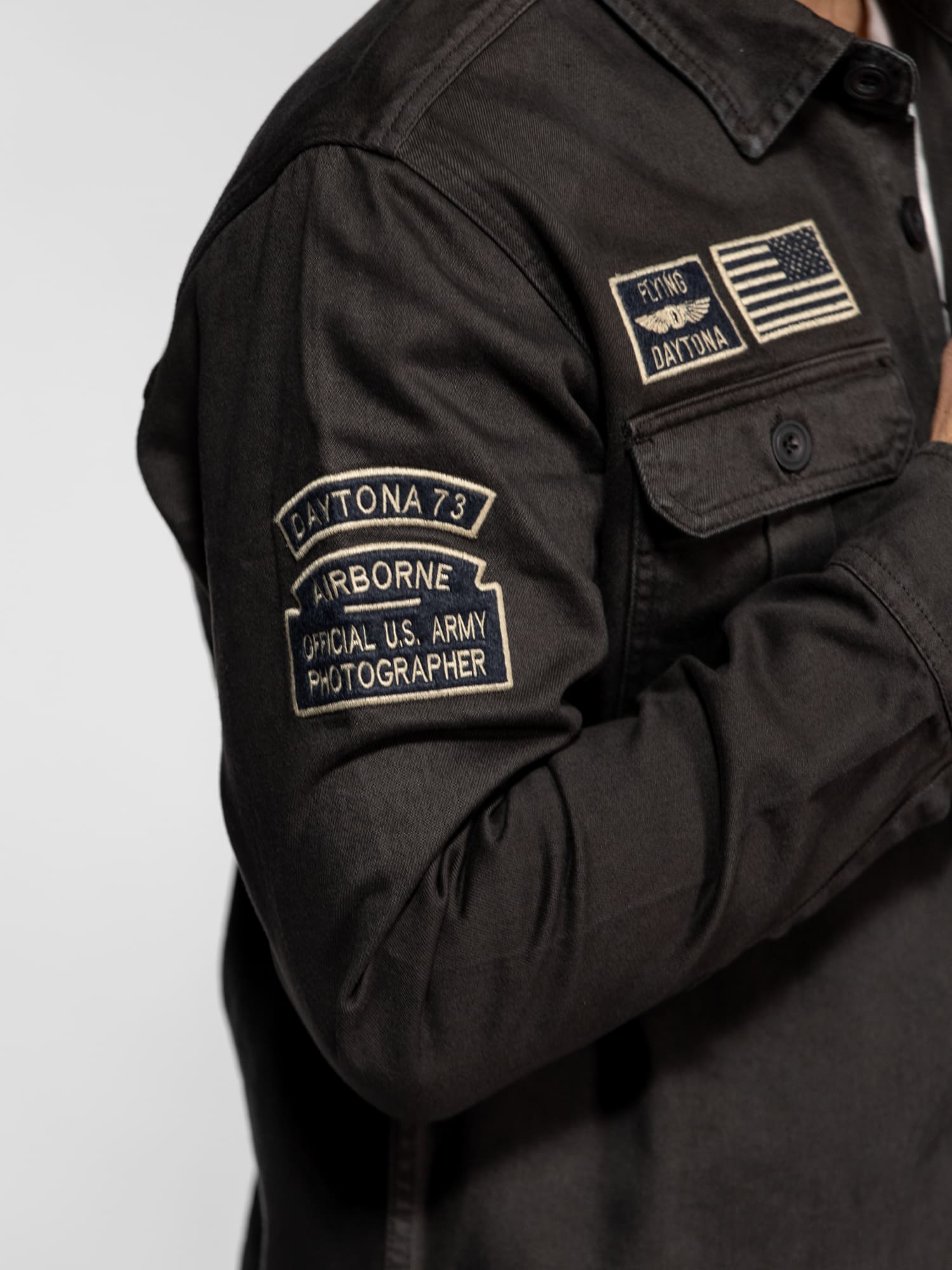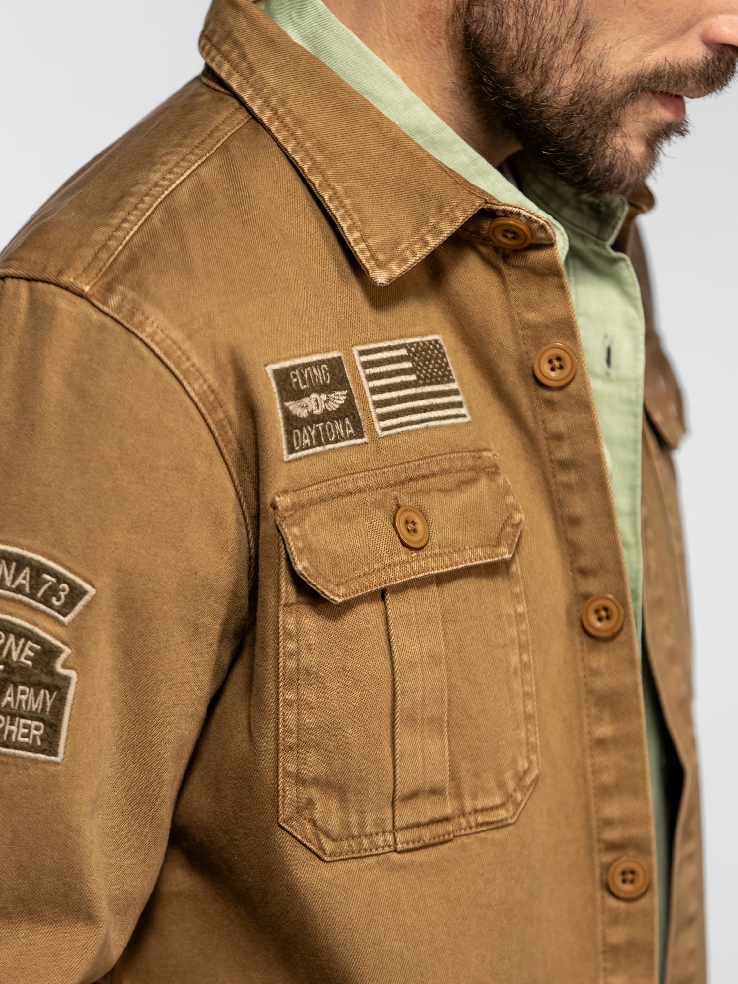 • Patchs brodés d’inspiration militaire sur la poitrine et les manches